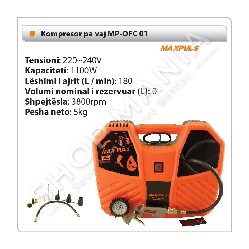 Maxpuls na servir fjalen e fundit te teknologjise per produktet profesionale, kompresor pa vaj me keto sepcifika: