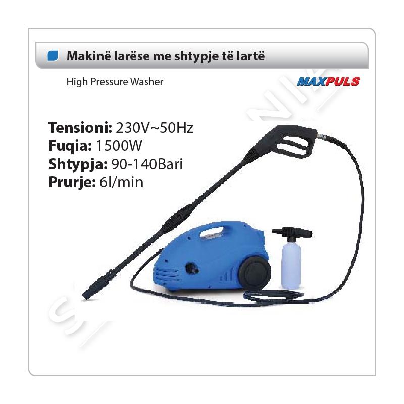 Makine larese me shtypje te larte e markes Maxpuls. Me fuqi 1500W dhe kapaciteti i shtypjes i cili i shkon deri ne 140Bari. Kapaciteti i prurjes 6l/min. Specifikat: