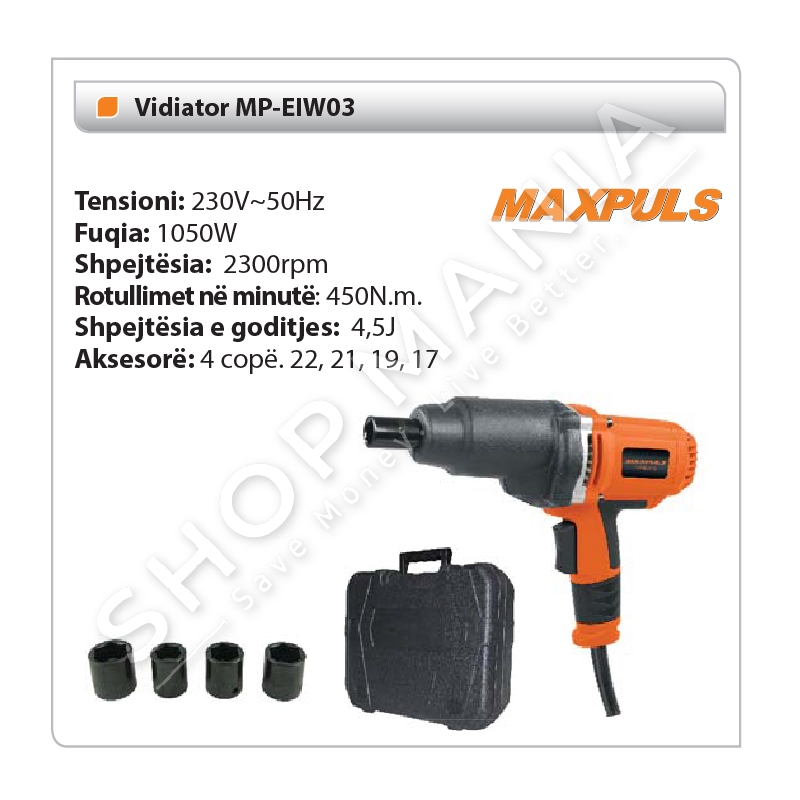 Vidiator i markes MaxPuls i tipit MP-EIW03.Ka nje tension qe shkon deri ne 50Hz dhe fuqi 1050W.Vjen i pajisur me nje valixhe shtese dhe 4 aksesore te madhesive te ndryshme.