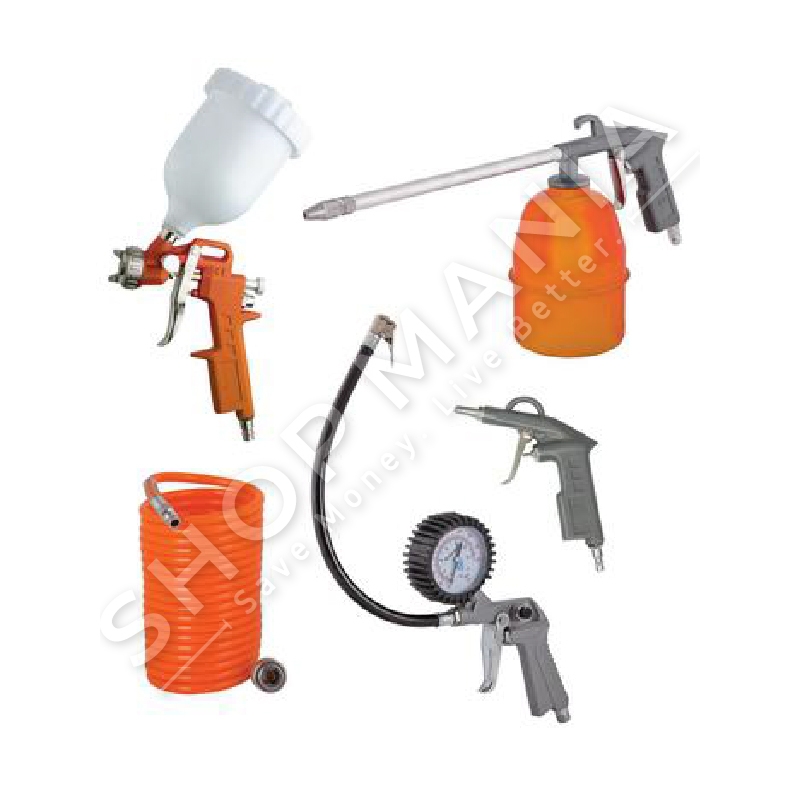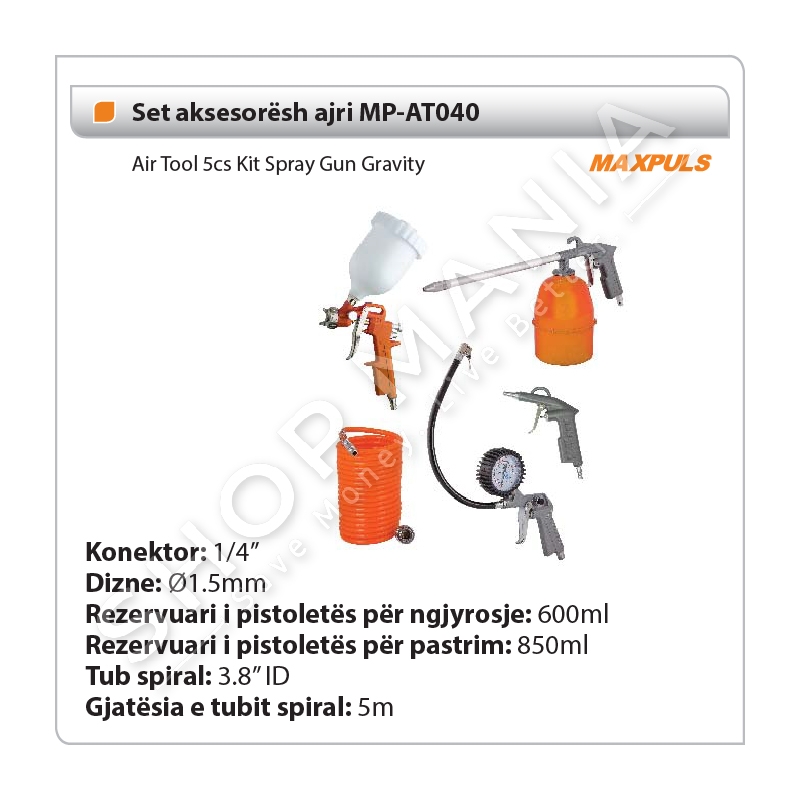 Set aksesoresh ajri per kompresor i markes MaxPuls lloji MP-AT020. Zoteron dy lloje rezervuaresh te pistoletes te cilet jane per ngjyrosje dhe per pastrim perkatesisht 600ml dhe 850ml Gjatesia e tubit spiral eshte 5m.