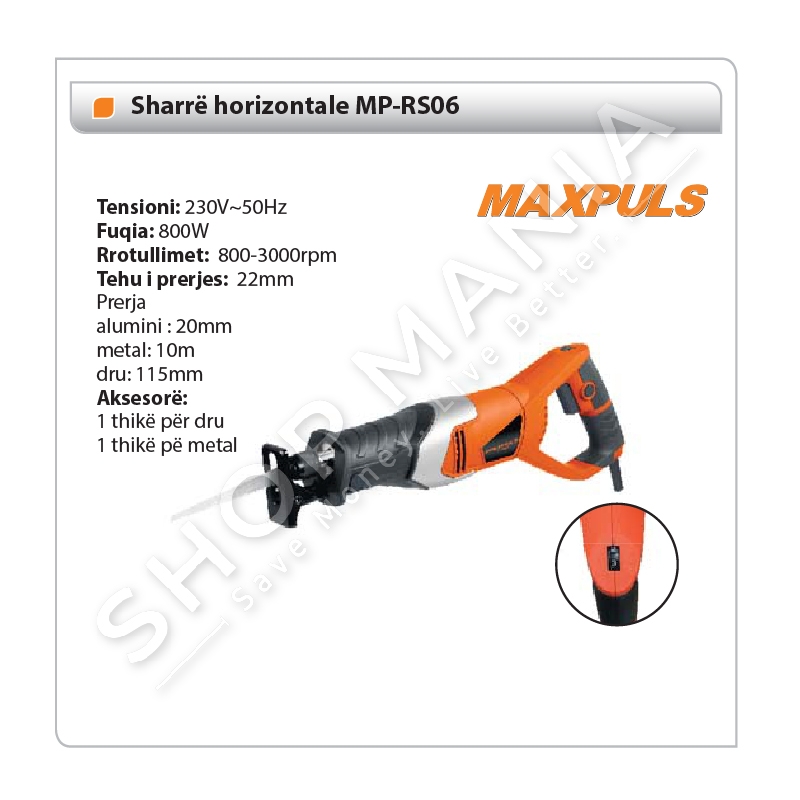 Sharre horizontale e tipit MP-RS30.Ka motor te shpejte dhe efikas.Perdoret per prerje te aluminit, metalit dhe drurit.E shoqeruar me dy thika nje per dru dhe nje per metal.