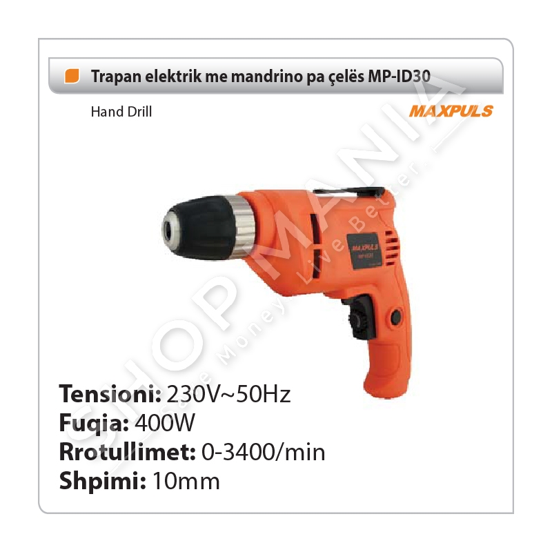 Trapan elektrik me mandrino pa celes i tipit MP-ID30.Duke qene se eshte hand drill eshte dhe teper praktik ne perdorim.Tensioni qe zoteron eshte 230V dhe varion deri ne 50Hz ndersa fuqia shkon deri ne 400W.