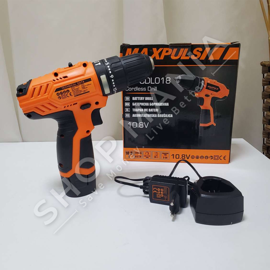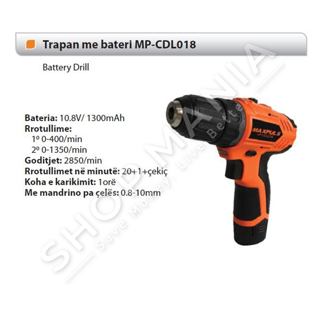 Trapan i markes MaxPuls modeli MP-CDL018.Ka nje bateri 108V/1300mAh.Koha e karikimit eshte 60 minuta.Kompakt dhe i lehte ne perdorim.