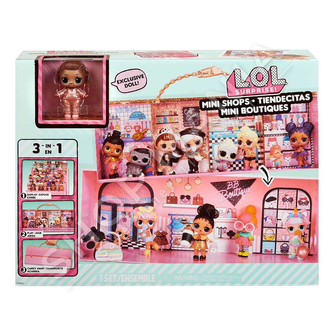 Doll LOL Surprise Mini Shops perfshin nje grup lojerash, ekspozite kukullash LOL dhe cante mbajtese 3 ne 1.