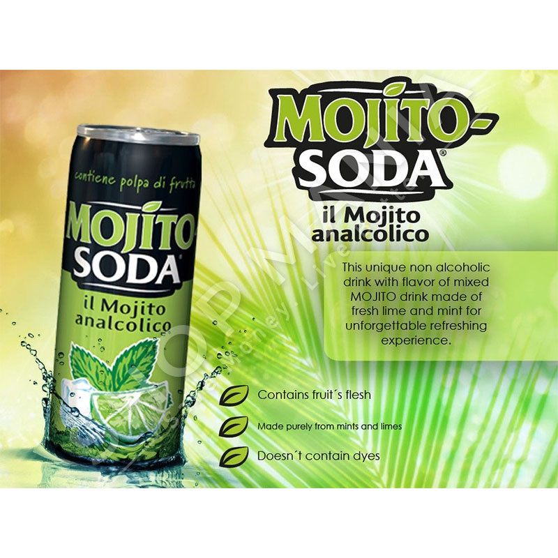 Mojito jo-alkoolike e gazuar. Pije freskuese, me limon 100% sicilian. Permban pulpe frutash.Pa ngjyrues dhe konservues. Vëllimi: 0.33LPërbërësit:
