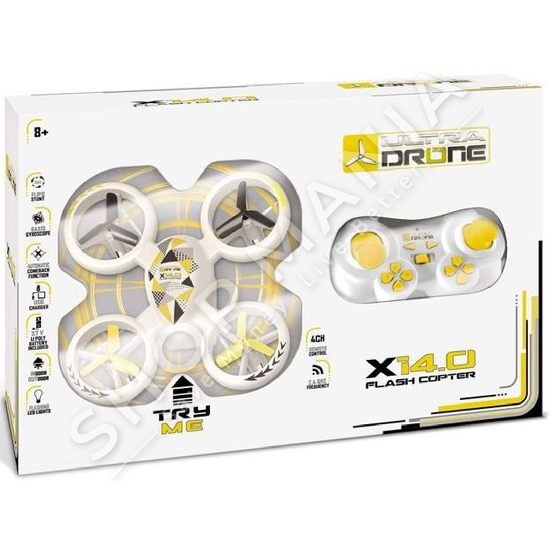 Dron ultra i shpejte dhe i lehte per t'u komanduar. Mund te kthehet automatikisht permes leves qe ushtron presion te forte poshte. Me drita LED per me shume ndricim ne fluturim. Me nje sistem kontrolli 2.4 GHz dhe me shume shpejtesi ne fluturim. Mosha: +14 vjec