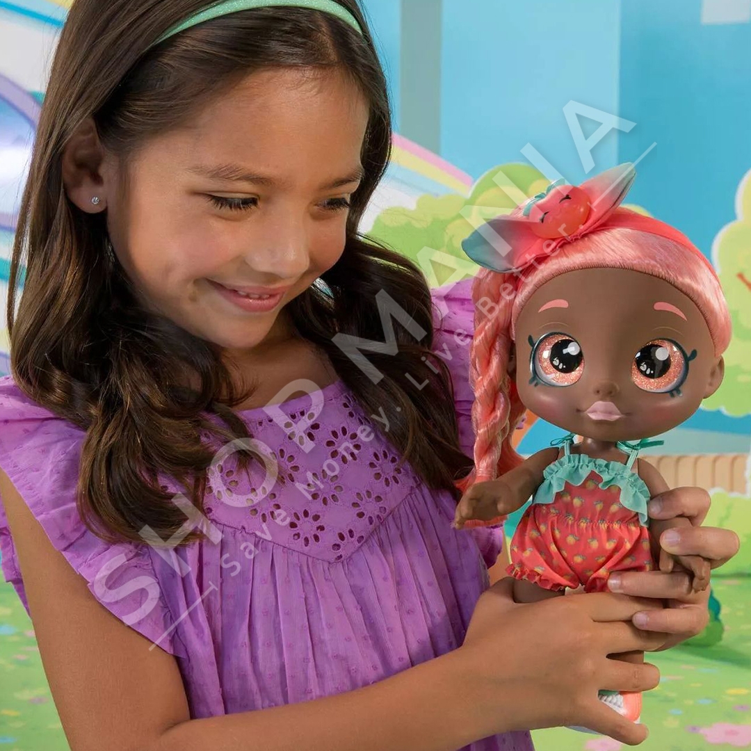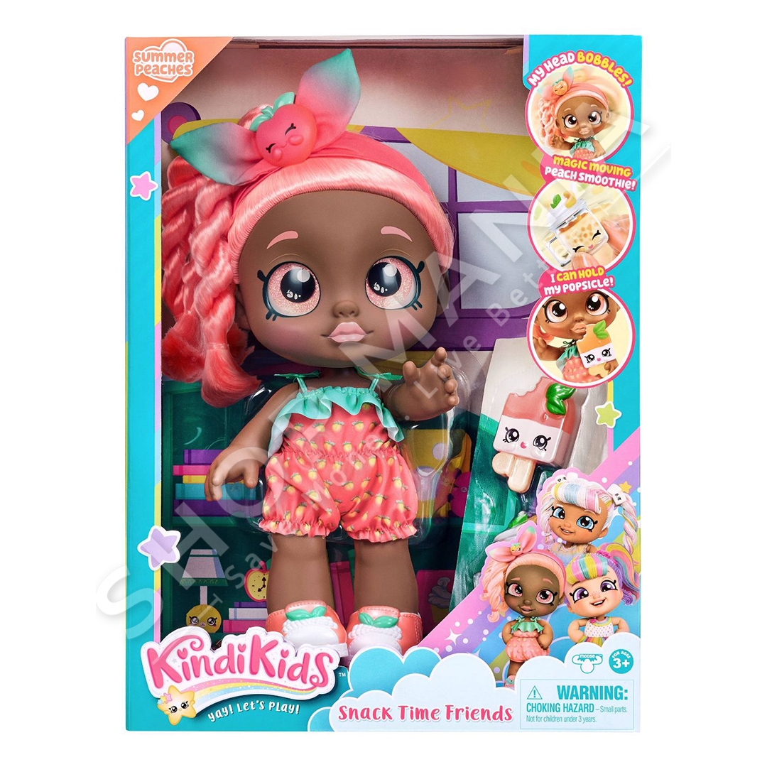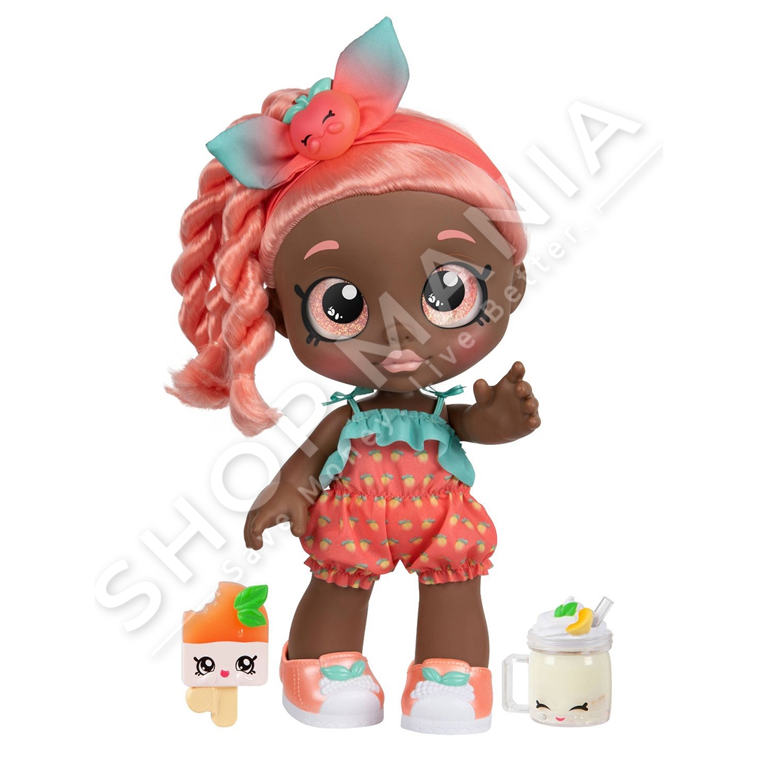 Kindi Kids Snack Time Friends Summer Peaches eshte kukulla mulate Summer Peaches me sy te medhenj plot shkelqim ne ngjyre pjeshke. Me nje veshje stil, me nje jumpsuit ngjyre portokalli me dizenjo te frutit te pjeshkes gjithandej. E veshur me atlete dhe me floket e mbledhur ne nje ane, bashke me nje rrip per floket po ashtu ngjyre pjeshke. Vjen se bashku me aksesoret: nje Smoothie me shije pjeshke, dhe nje akullore me shije pjeshke. Mosha: +3 vjec