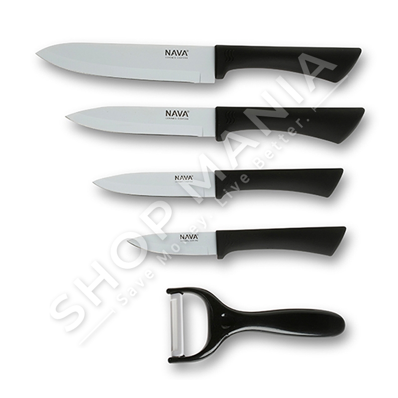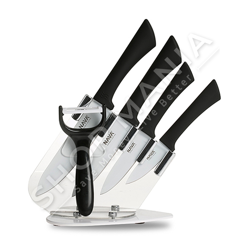 Me mbajtese akriliku qe thikat te jene gjithmone te sistemuara.Seti perfshin kater thika, nje qeruese patatesh dhe nje mbajtese arkeliku.