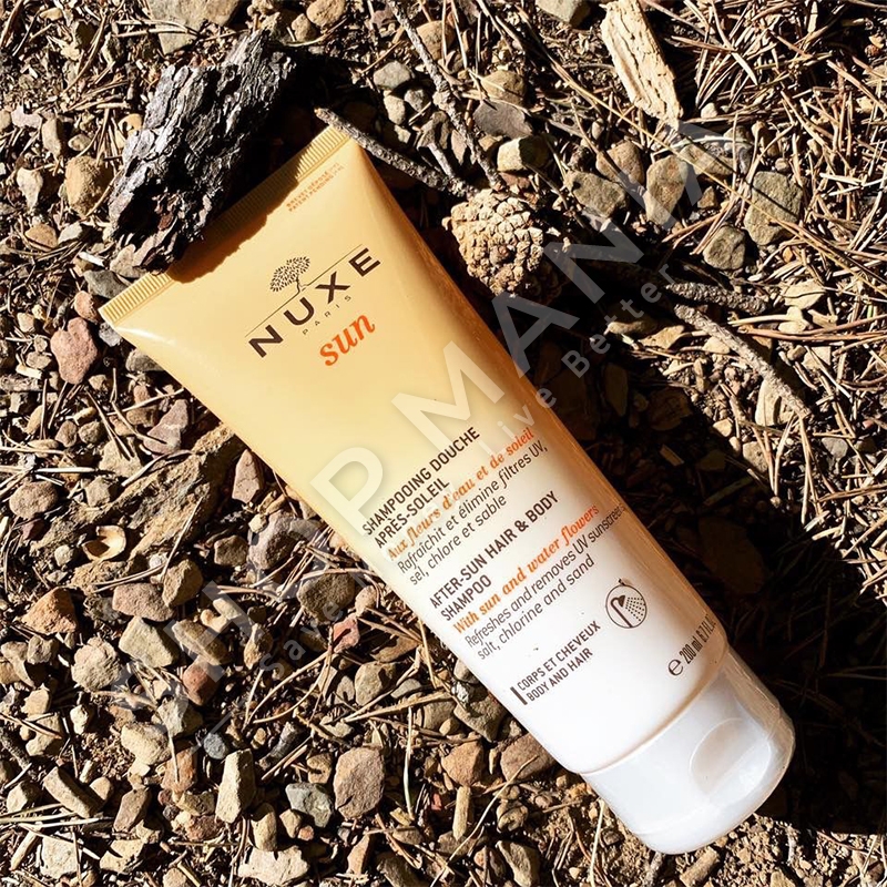Shampo per floket dhe trupin “Pas diellit” me ekstrakte luledielli dhe lule uji.