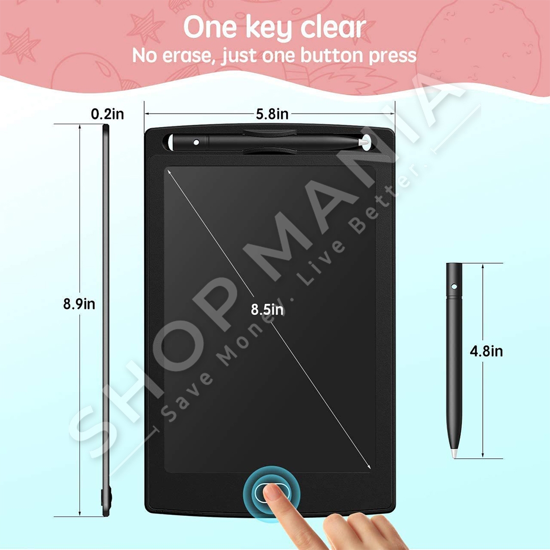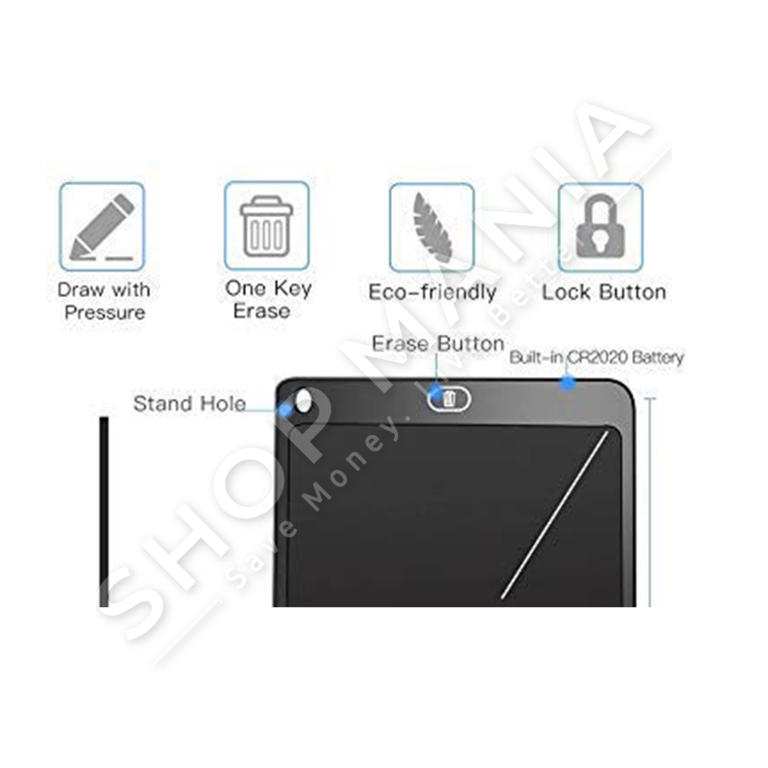 Panel shkrimi per femije me ekran LCD pa rrezatim dhe shkelqim verbues. Nuk i demton syte e femijeve nderkohe qe i argeton. Madhesia prej 8.5 inch (22 cm) e panelit te shkrimit ben te mundur qe ai te perdoret kudo pasi eshte praktik dhe i vogel. Ka butonin e ndezjes dhe te fikjes dhe nje laps me te cilin femijet vizatojne dhe zhvillojne kreativitetin e tyre. Materiali i panelit dhe i ekranit te tij eshte plastik i qendrueshem dhe eshte i sigurt. Mund te fshini vizatimet ose fjalet qe shkruani ne ekran vetem me prekjen e nje butoni.