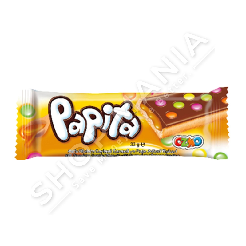 Biscuit (35%) (Wheat flour (contains gluten) , vegetable oil (palm), sugar, fructose syrup, whole milkpowder ,raising agents (ammonium bicarbonate, sodium acid pyrophosphate, sodium bicarbonate),salt, emulsifier(sunflower lecithin)),Milk Chocolate (32%) (Sugar, cocoa butter, whey powder , wholemilk powder , cocoamass, emulsifier (sunflowerlecithin), flavour (vanillin)), Caramel (22%) (Glucosesyrup, vegetable oil (palm), sugar, humectant (sorbitol), whole milk powder , whey powder (milkproduct) , salt, emulsifier (mono and diglycerides of fatty acids), flavour (caramel)), Dragee candies(11%) (Sugar, vegetable oil (palm), whey powder (milk product) , corn starch, cocoa powder,thickener (Gum arabic), emulsifier (sunflower lecithin),flavour (vanillin),glazing agent (carnauba wax,shellac), colours (titanium dioxide, beetroot juice, beta caroten, copper complexes of chlorophyllin,turmeric)).Milk chocolate contains min 30% cocoa solids and min. 25% milk solids