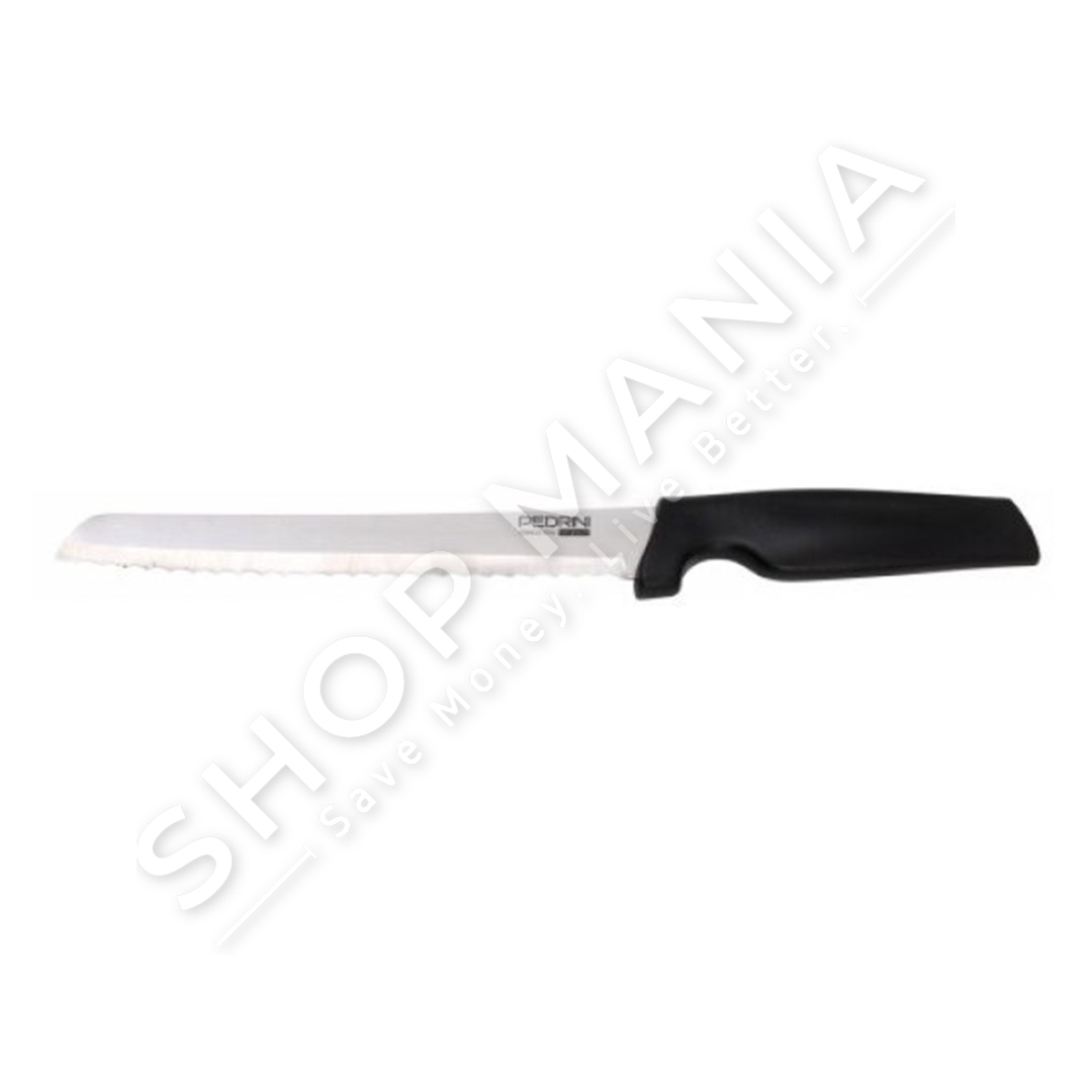 Përshkrimi:Thike buke inoksi, nga Pedrini. Priteni buken ne menyre rregullt dhe pa u lodhur, me thiken e duhur. Material cilesor inoksi, i sigurt me ushqimin dhe shume efikas ne prerje.