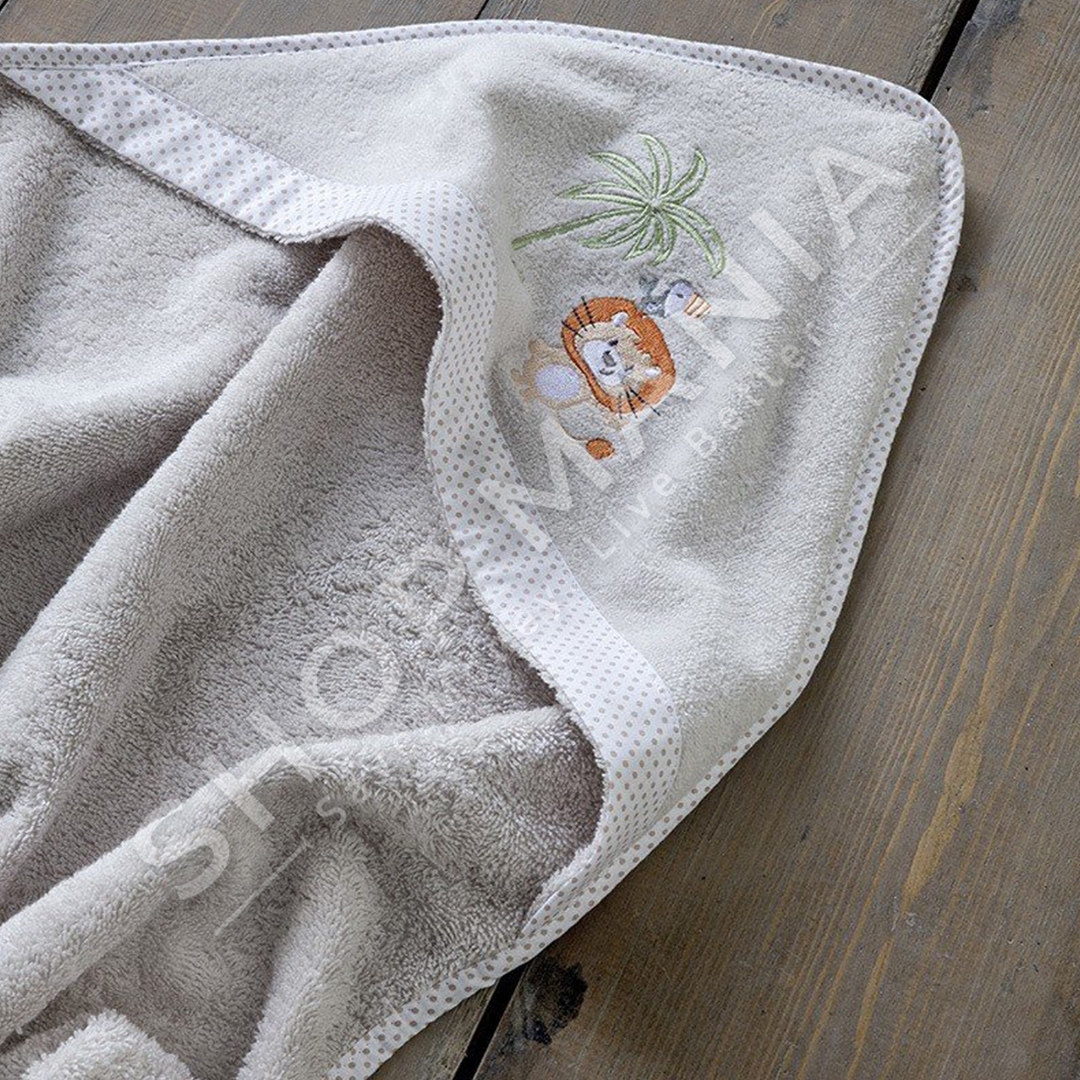 Peshqir 100% pambuk natyral, shume i bute dhe absorbues, i pershtatshem per lekuren e ndjeshme te foshnjes pas banjes se perditshme. Ka nje strukture shume te bute prej kadifeje nga ana e jashtme dhe peshqir ne pjesen e brendshme, ne menyre qe te thith ujin me mire dhe le lekuren e foshnjes te thate dhe te bute. Perberja e saj e pambukut eshte antialergjik, rezistent ndaj larjes se shpeshte ruan ngjyren dhe formen e tij te pandryshuar pa pasur nevoje per kujdes te veçante.