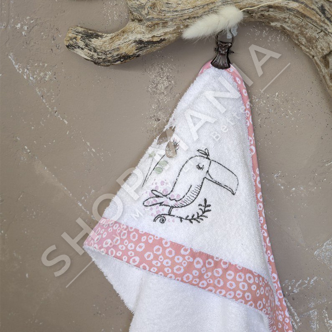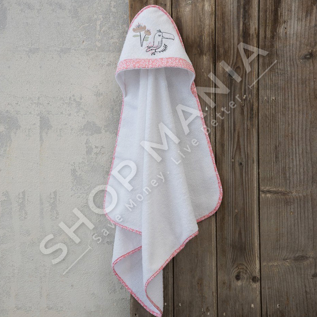 Peshqir 100% pambuk natyral, shume i bute dhe absorbues, i pershtatshem per lekuren e ndjeshme te foshnjes pas banjes se perditshme. Ka nje strukture shume te bute prej kadifeje nga ana e jashtme dhe peshqir ne pjesen e brendshme, ne menyre qe te thith ujin me mire dhe le lekuren e foshnjes te thate dhe te bute. Perberja e saj e pambukut eshte antialergjik, rezistent ndaj larjes se shpeshte ruan ngjyren dhe formen e tij te pandryshuar pa pasur nevoje per kujdes te veçante. Specifikat: