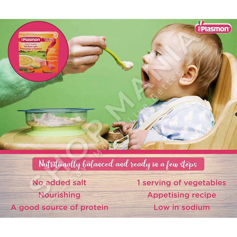 Pureja me perime, proshute derri dhe makarona permban te gjitha vlerat ushqyese qe i duhen femijes per nje vakt te kompletuar.
