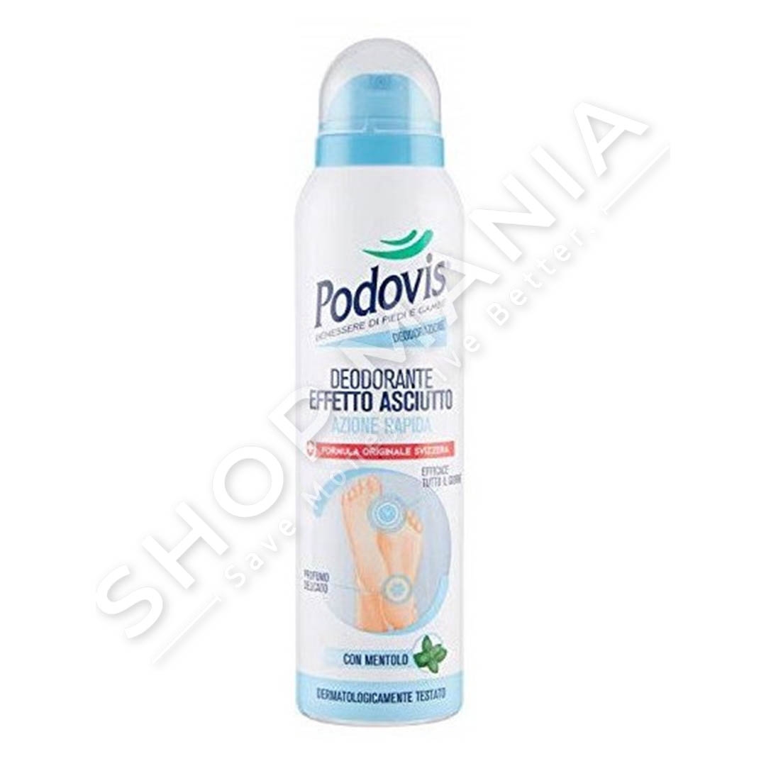 Deodoranti Podovis Dry Effect Con Mentolo, me efekt te thate ndihmon per te eleminuar eren e pakendshme te kembeve ne nje kohe te shkurter fale veprimit te tij te shpejte dhe aromes delikate me mente.