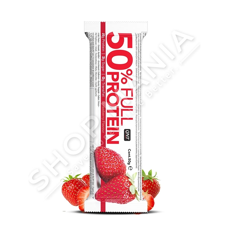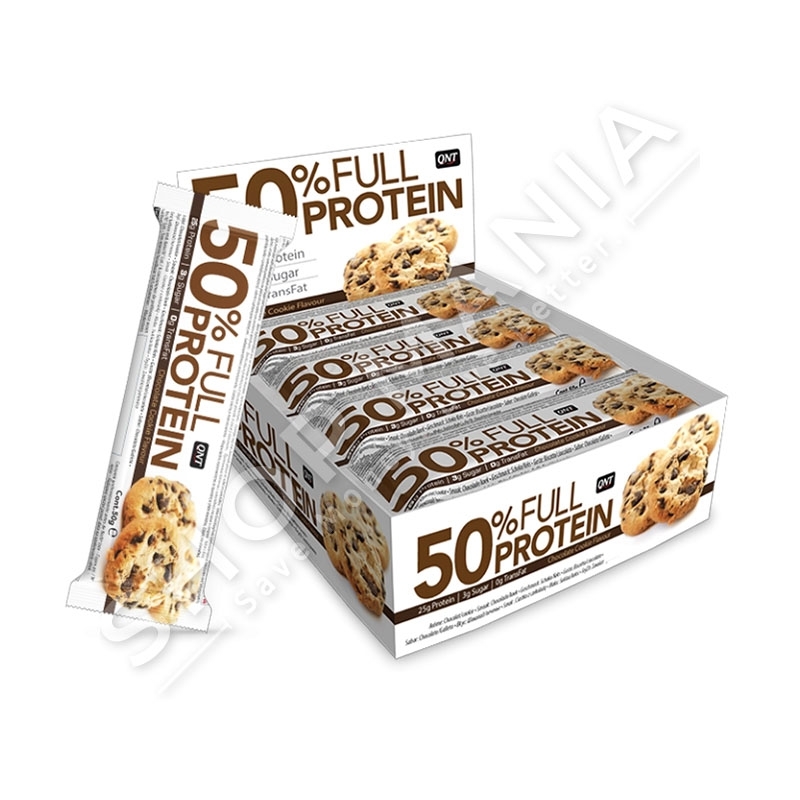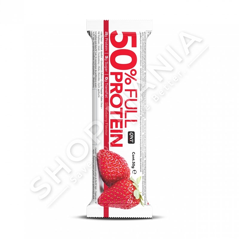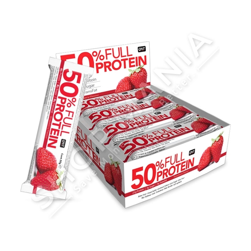 “50% FULL PROTEIN BAR” permbajne 25g proteina qe vijne nga nje perzierje e ekuilibruar qe perfshin izolatin e proteinave te qumeshtit dhe koncentratin e proteinave te hirres.