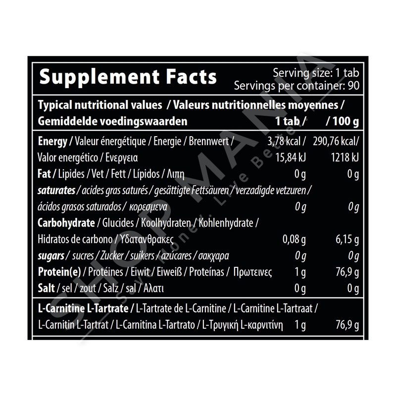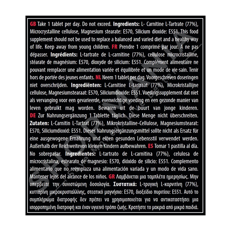 L-Karnitine L-Tartrat(77%) Celuloze mikrokristaline Stearat Magnezi E570 Dioksid Silici E551
