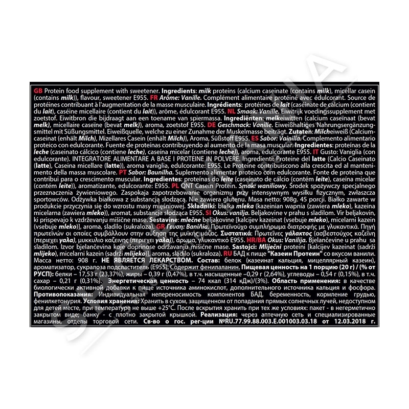“CASEIN PROTEIN” me shije vanilje, eshte nje perzierje e kazeines micelare dhe kazeinatit te kalciumit.