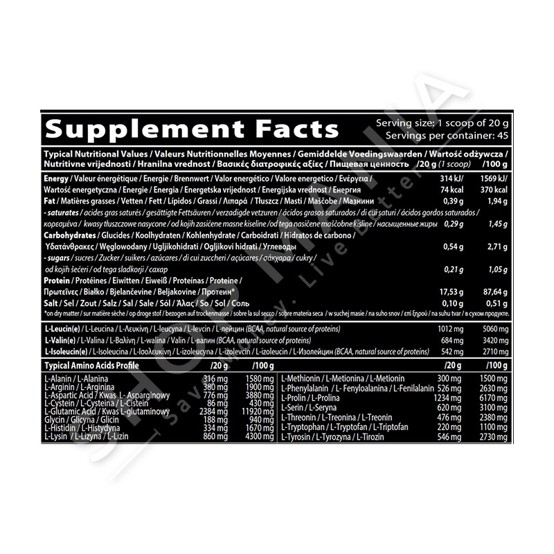 Kjo formule sjell nje proteine qe mban cdo veti te vetme biologjike me nje profil te shkelqyeshem aminoacidi duke perfshire nje perqendrim te larte te BCAA.