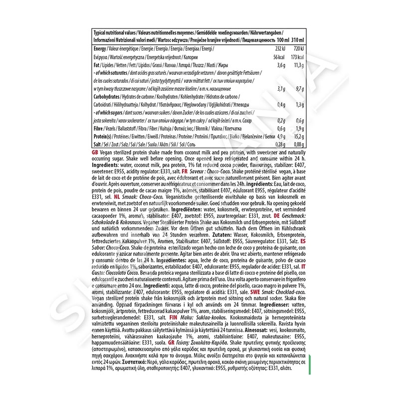 Uje Qumesht kokosi Proteina bizele Pluhur kakao me yndyre te reduktuar 1% Aromatizues Stabilizues E407 Embelsues E955 Rregullator i aciditetit E331 Kripe
