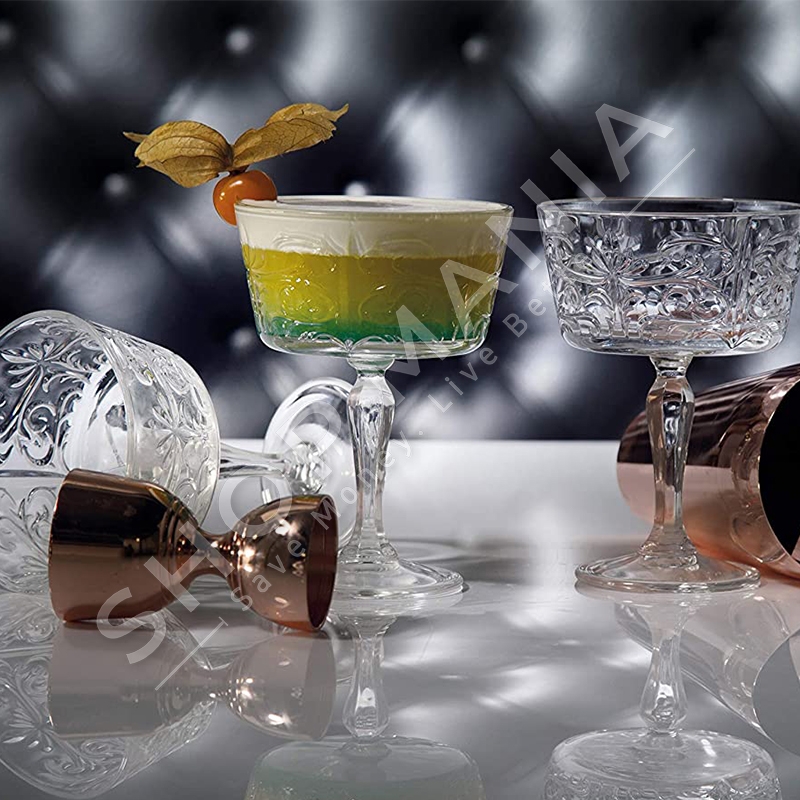 Set me gota te dekoruara qelqi “Tattoo”, me stil klasik dhe bisht, te pershtatshme per shampanje.
