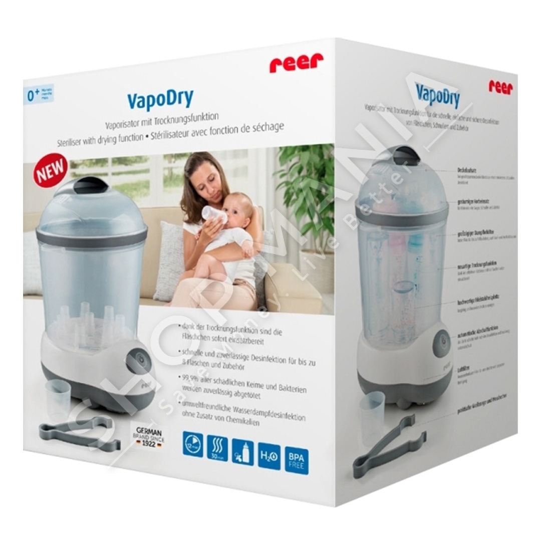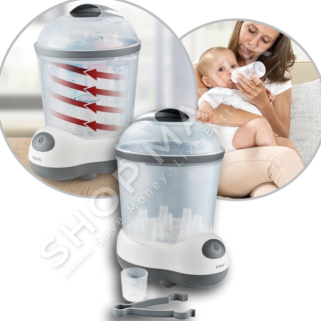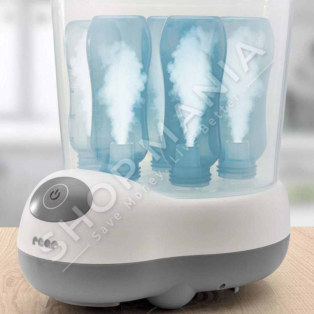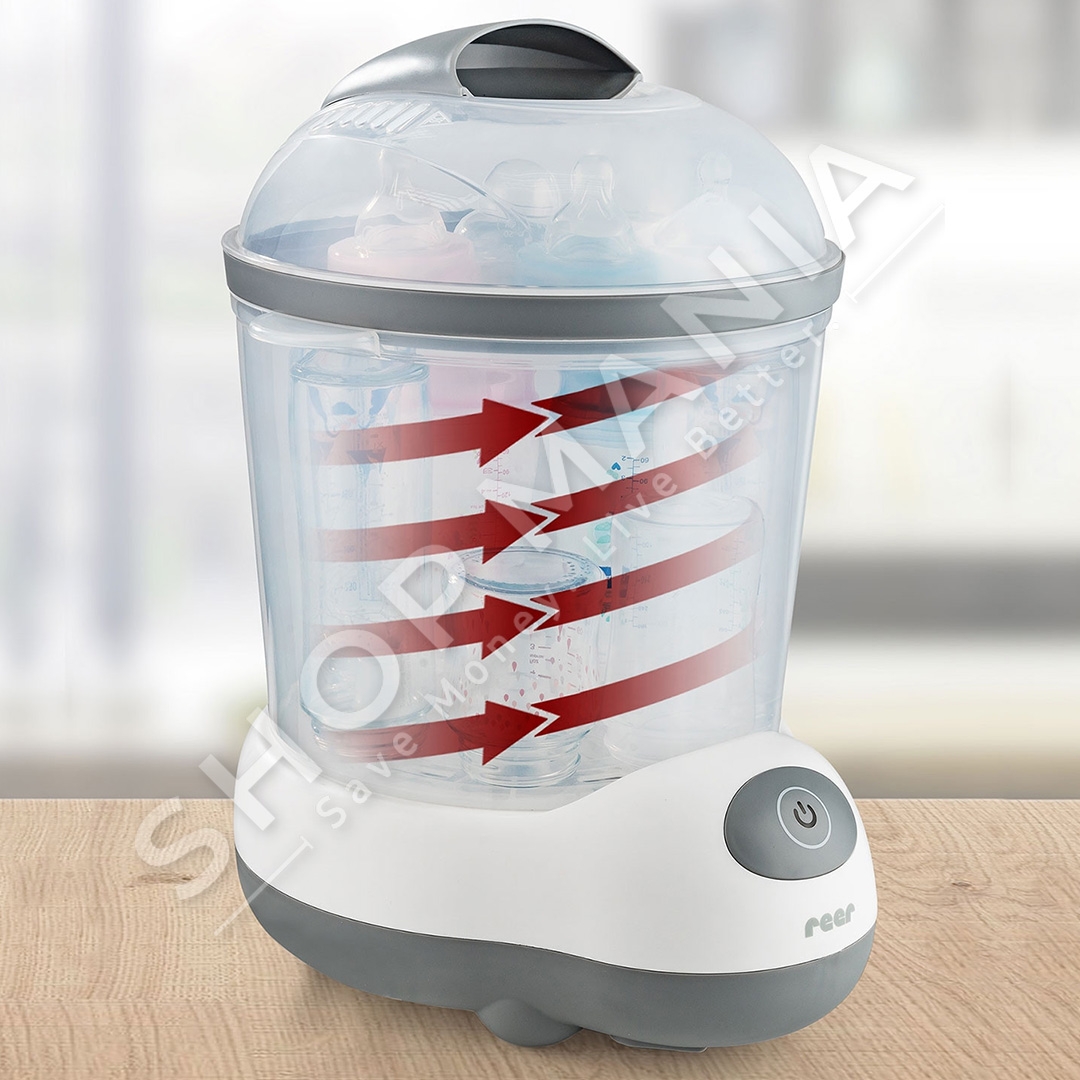 Sterilizues elektrik me funksion tharje per biberonat e femijeve. Duke perdorur teknologjine me avull te nxehte qe kursen energji, kjo pajisje sterilizon shishet dhe biberonet shpejt per vetem 12 minuta. Fale funksionit te tharjes, shishet mund te riperdoren menjehere pas 30 minutash. Ofron hapesire per deri ne 8 biberona. Gjithashtu me funksionin e fikjes automatike pas dezinfektimit dhe tharjes, duke parandaluar mbinxehjen e pajisjes.