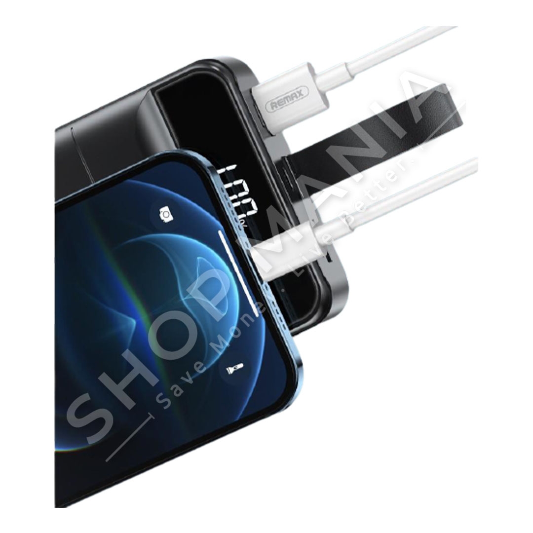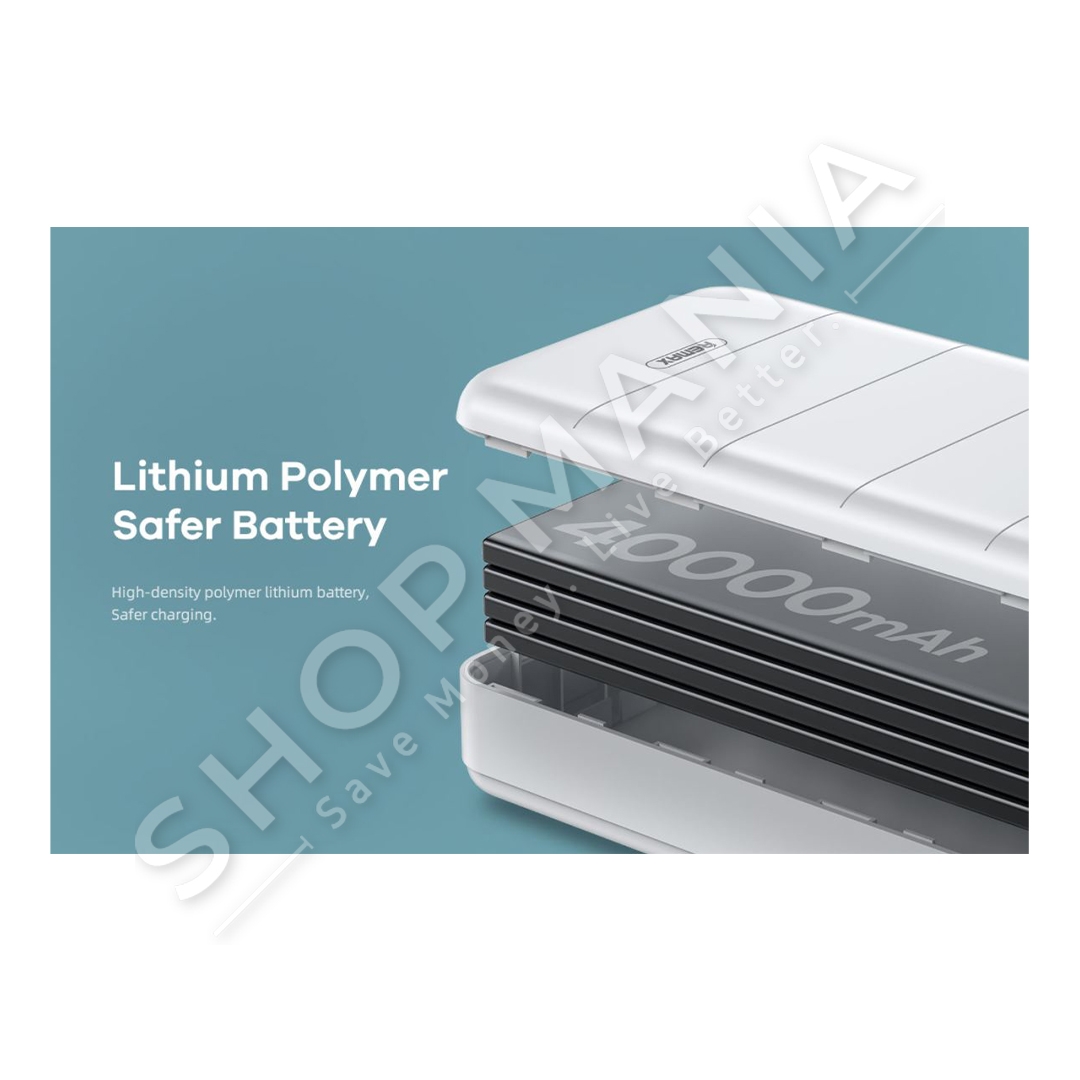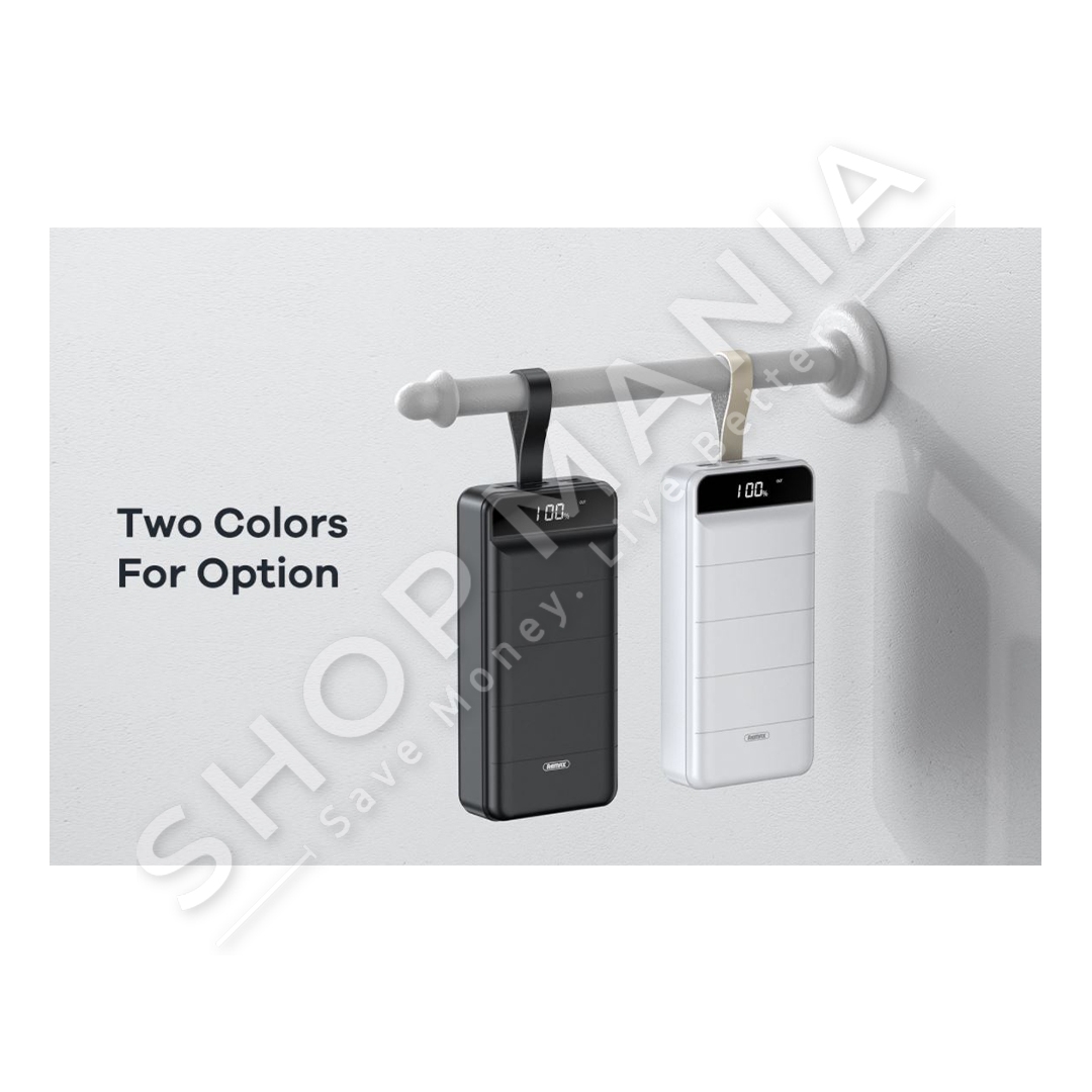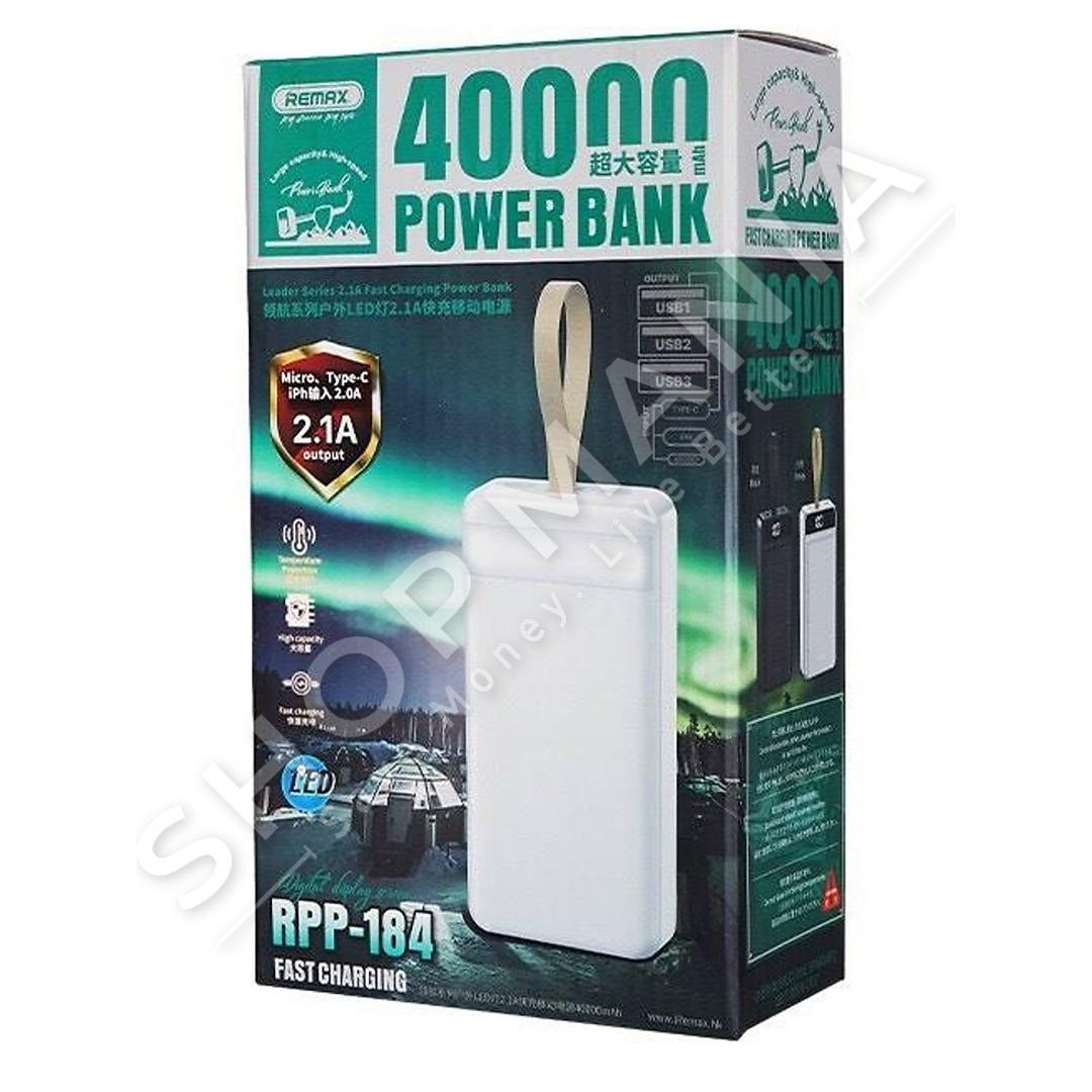 Power Bank Remax RPP-184 me ekran LED dhe me dizajn modern. Me 3 porta hyrjeje dhe 3 daljeje, Power Bank eshte ne gjendje te karikoje pajisje te shumta ne te njejten kohe si psh: telefona, kamera dixhitale, MP3/MP4. Ne pjesen e siperme eshte i pajisur me nje litar per mbajtje te lehte dhe lehtesi ne karikim. Kur karikohet, tubi dixhital pulson dhe shfaq statusin aktual te energjise dhe kur ngarkohet plotesisht shfaq 100% dhe drita mbetet e ndezur. Kur tensioni i baterise eshte me i ulet se 3V, Power Bank fiket automatikisht.