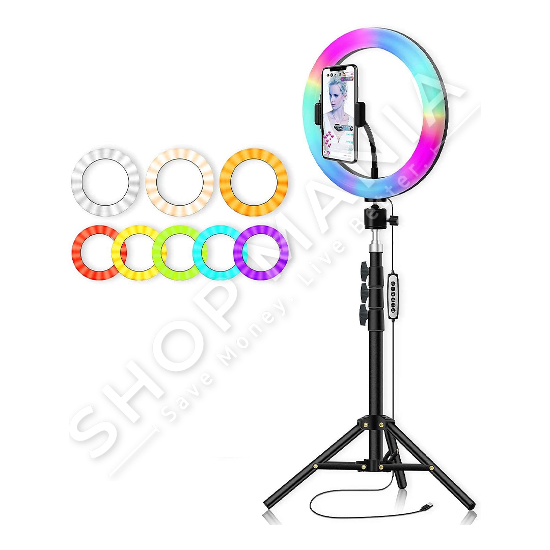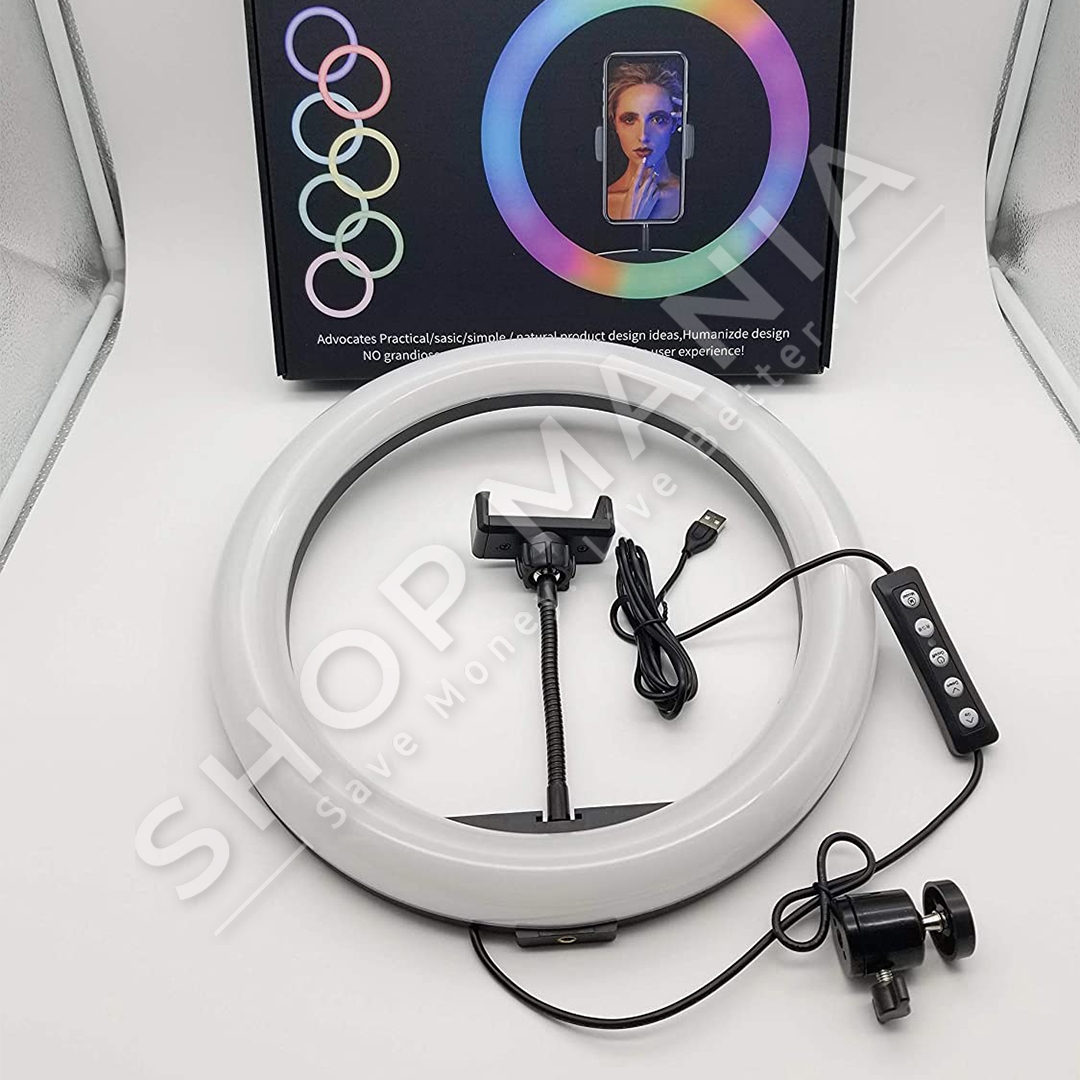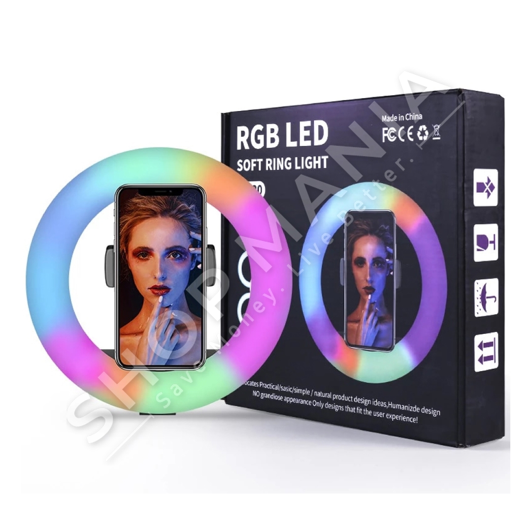 Ky ring light ka një diametër prej 33 centimetrash dhe është i pajisur me një kontrollor për të ndryshuar ngjyrat dhe efektet e ndriçimit, duke ofruar një zgjedhje të gjerë të ngjyrave dhe modeleve të ndriçimit. Ajo gjithashtu vjen me një stativ që mund të rregullohet në lartësi dhe një aparat për të montuar telefonin celular në qendër të ringut.