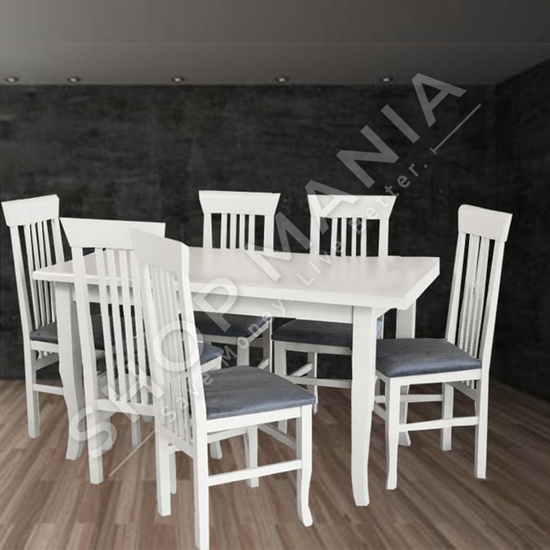 Përshkrimi:Set me 6 karrige prej druri me dizajn klasik, te cilat i shtojne bukuri dhe elegance ambientit te shtepise.Sigurojne rehati maksimale fale ndenjeses se bute.Me strukture druri ahu rezistent ndaj perdorimit.Specifikat:Materiali: DruMe dizajn klasik dhe elegantMe ndenjese dhe mbeshtetese te buteNgjyra: E bardhe