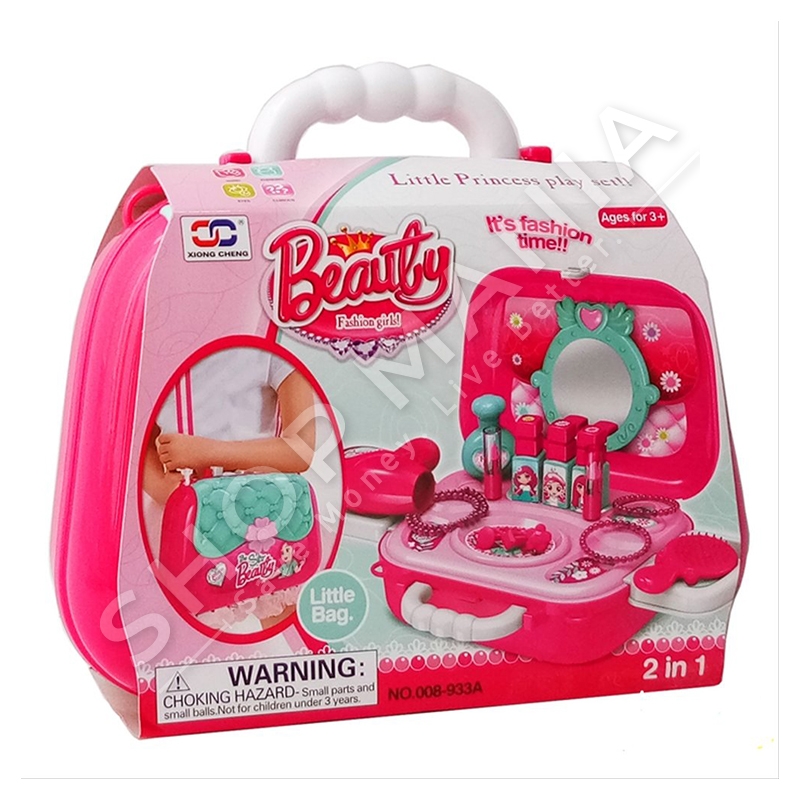 Canta e bukurise per vajza, e cila permban disa aksesore kozmetike si tharese flokesh, buzekuq, rrathe, unaza, shishe parfumi etj. si dhe afishe të paketuara ne valixhe 22x17x10cm.
