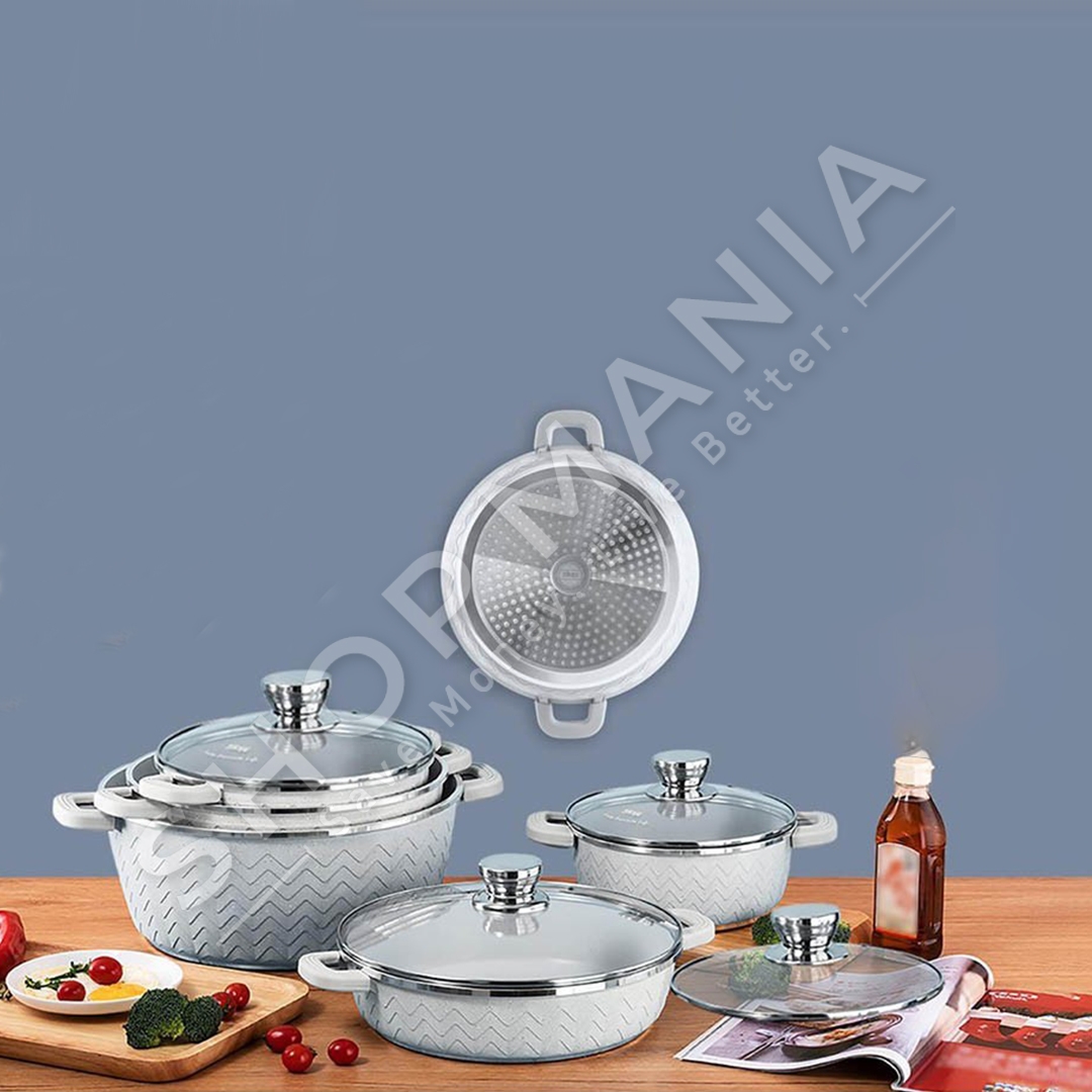 I perbere nga 2 tenxhere te thella me kapak, 1 tenxhere e vogel me kapak, 1 tenxhere te ceket me kapak, dhe 1 tenxhere te ceket pa kapak.