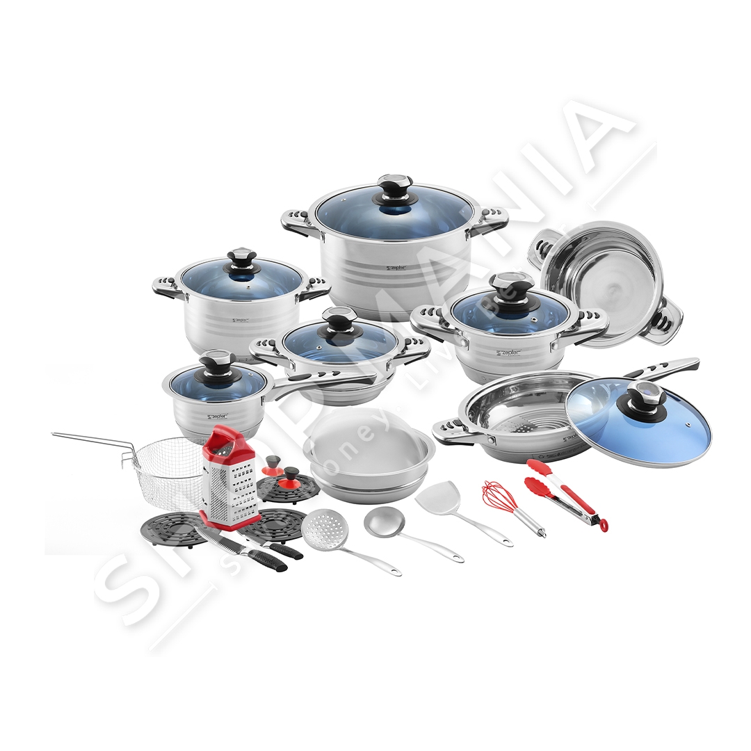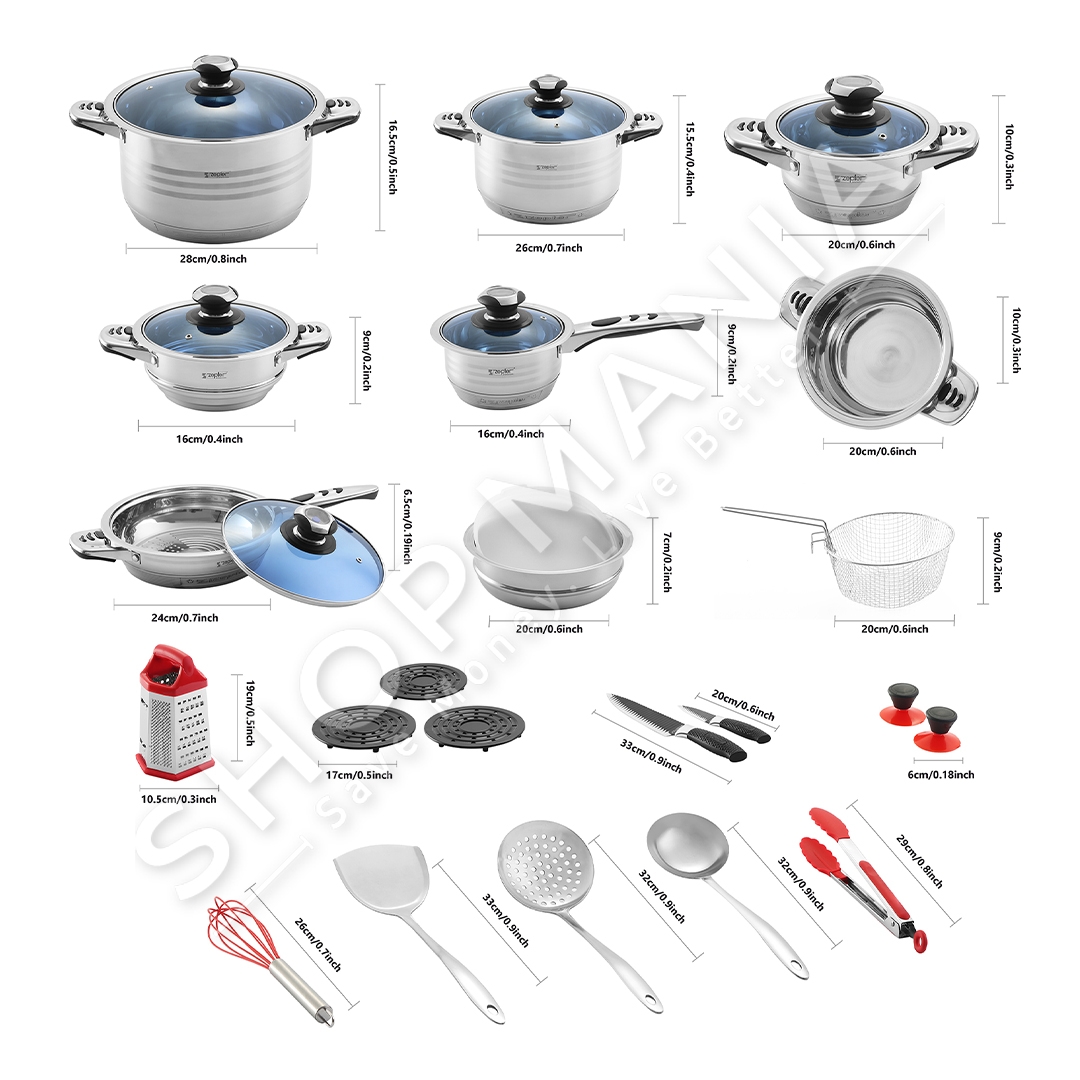 Set kuzhine me 30 pjese, per nje kuzhine te kompletuar deri ne detaje. Me material cilesor celik inoksi dhe me kapak prej xhami dhe veshje te jashtme rezistente ndaj nxehtesise.