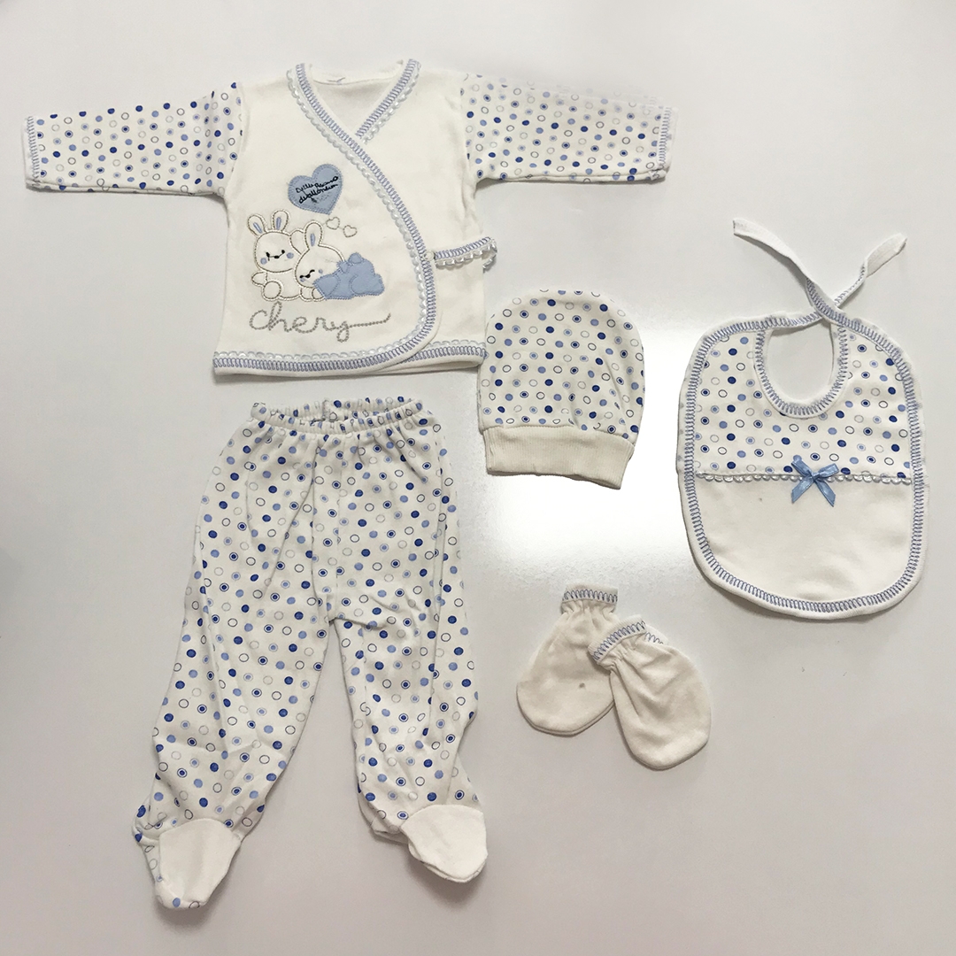 Set per te porsalindur me bluze me buton, me menge te gjata, tuta me corape, gushore, kapuc dhe dorashka per bebe.