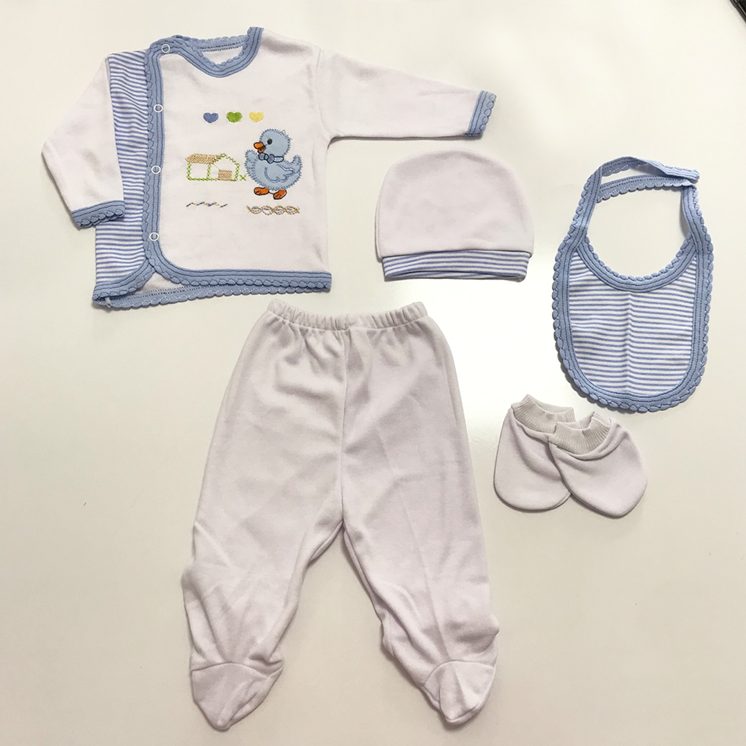Set per te porsalindur me bluze me buton, me menge te gjata, tuta me corape, gushore, kapuc dhe dorashka per bebe.