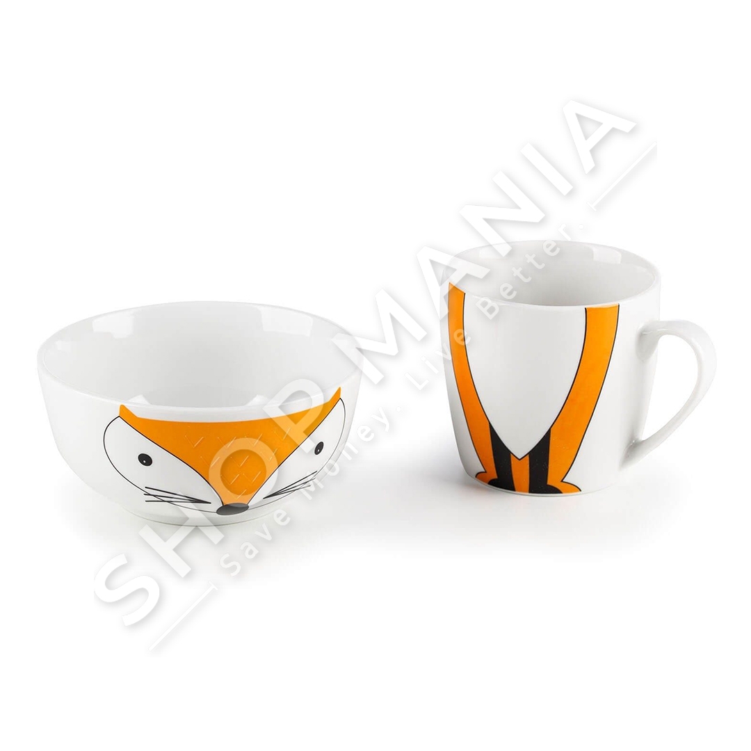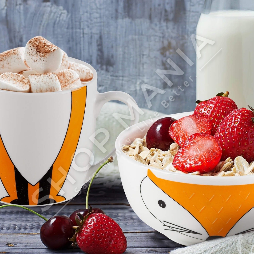 Seti permban nje filxhan per pije dhe nje tas per drithera, perime, fruta apo ushqime te tjera