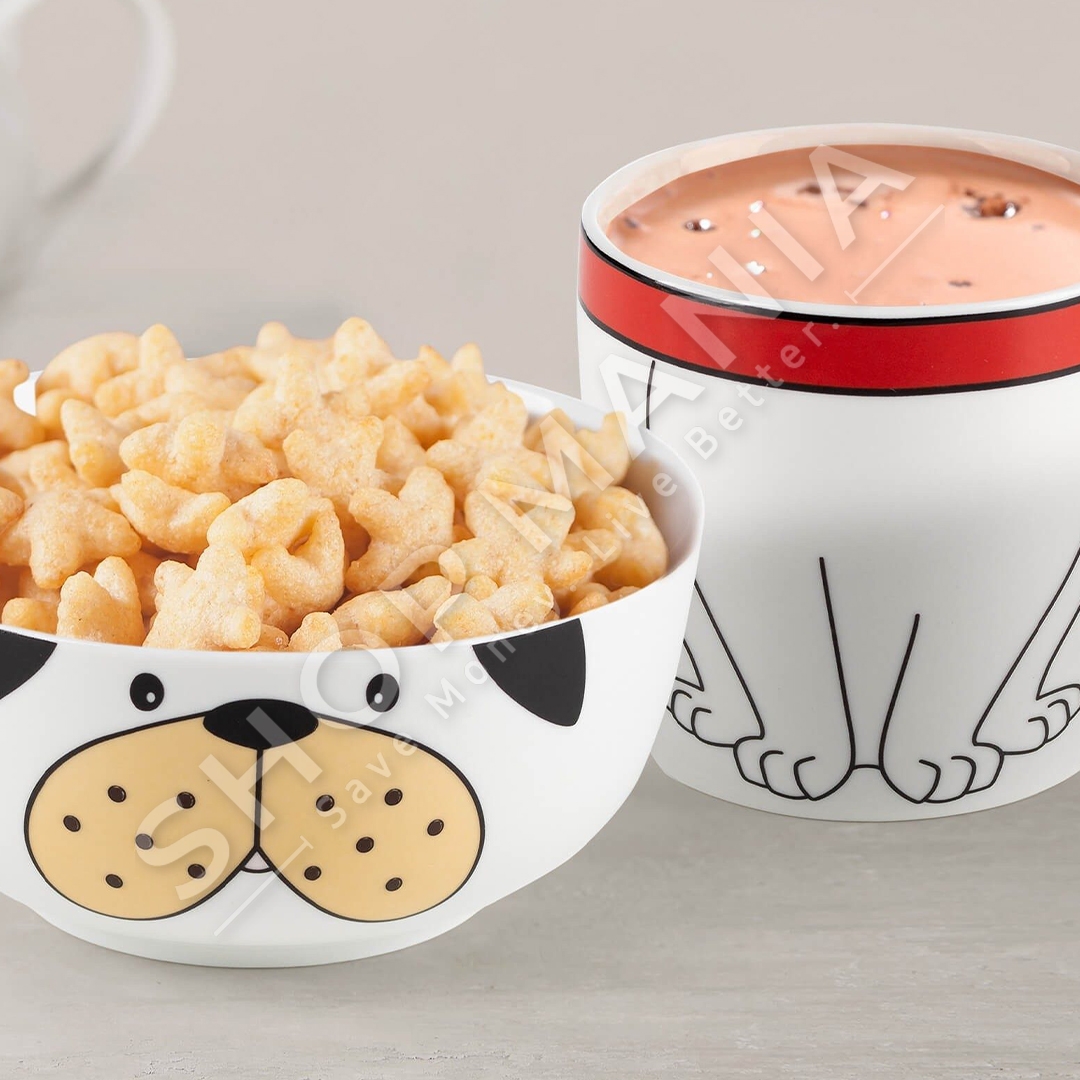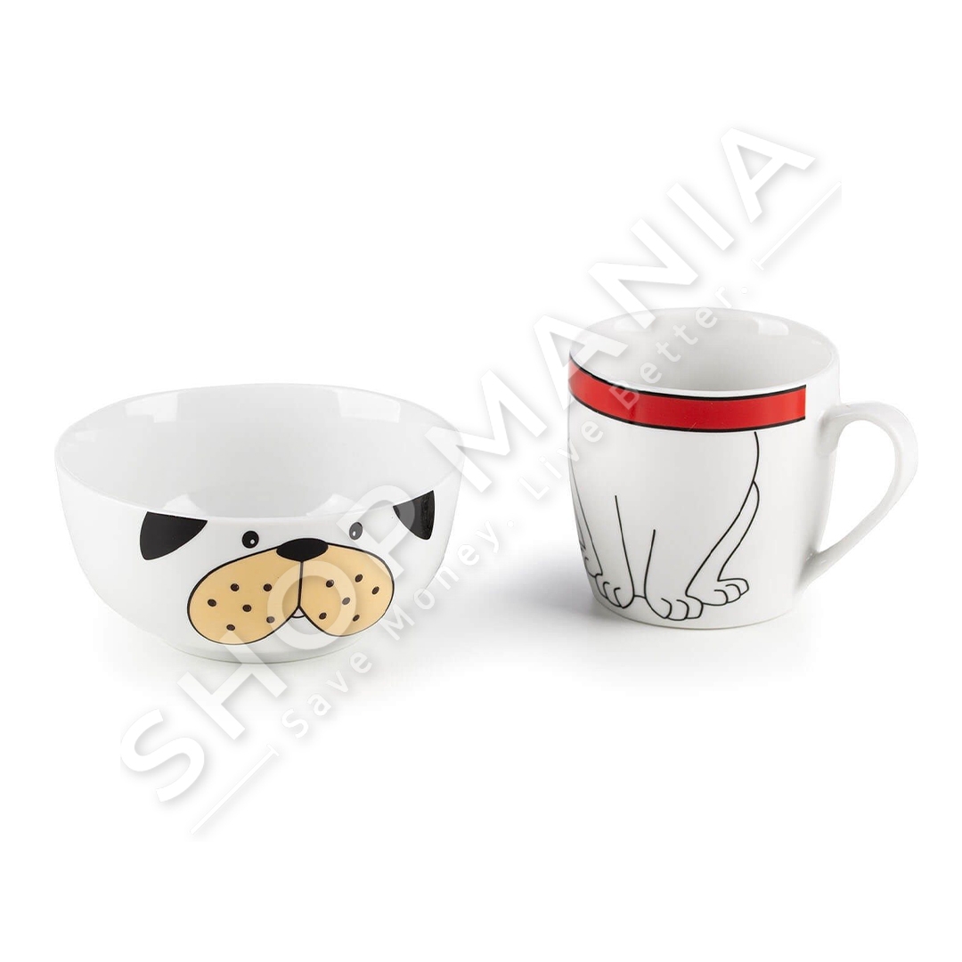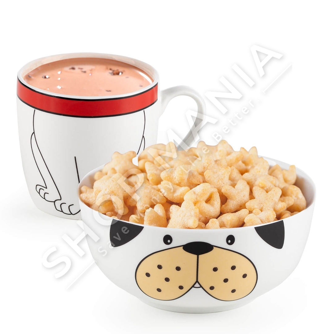 Ngrenia e mengjesit do te jete koha me argetuese per femijet me setin me dy pjese me dizajn qeni. Seti permban nje filxhan per pije dhe nje tas per drithera, perime, fruta apo ushqime te tjera.