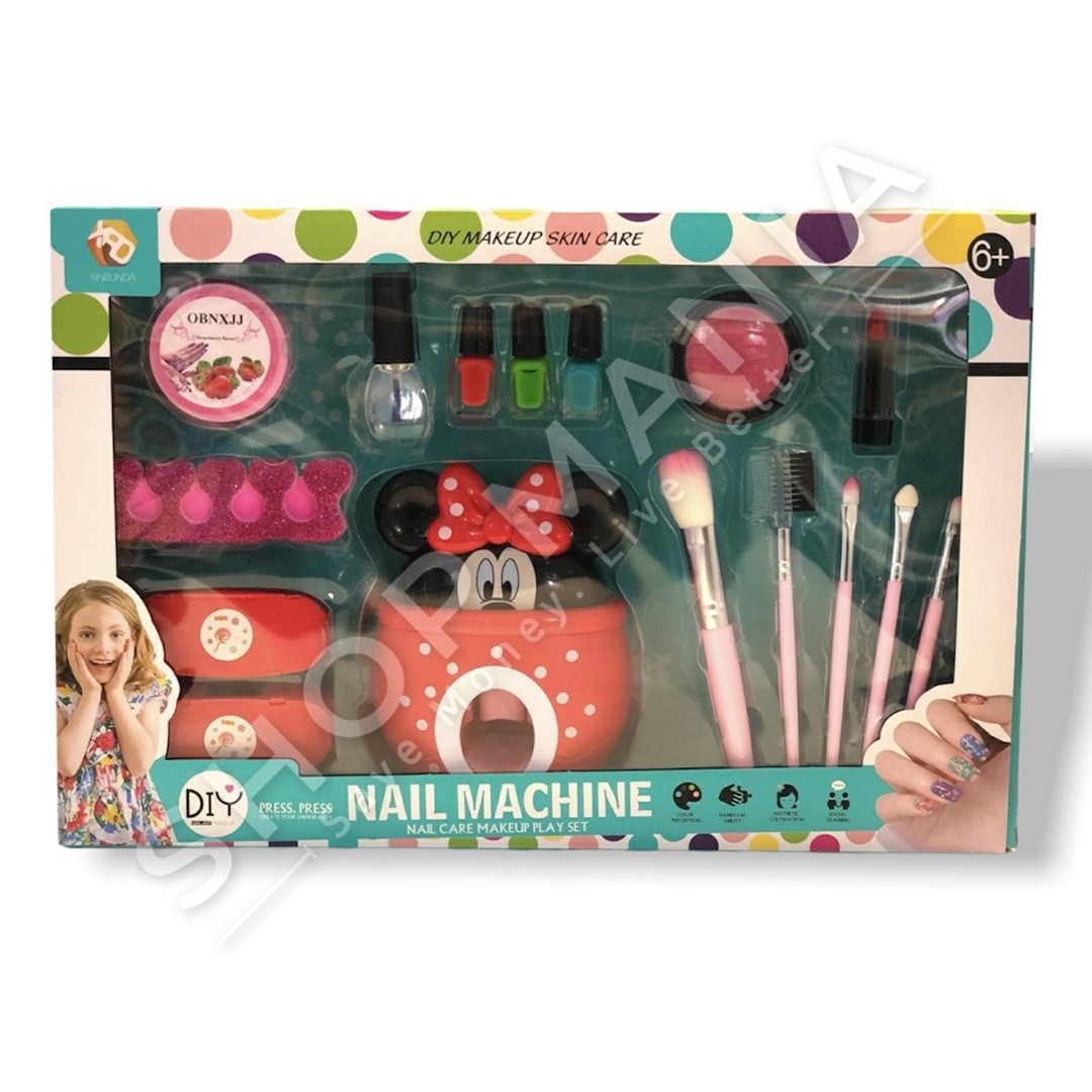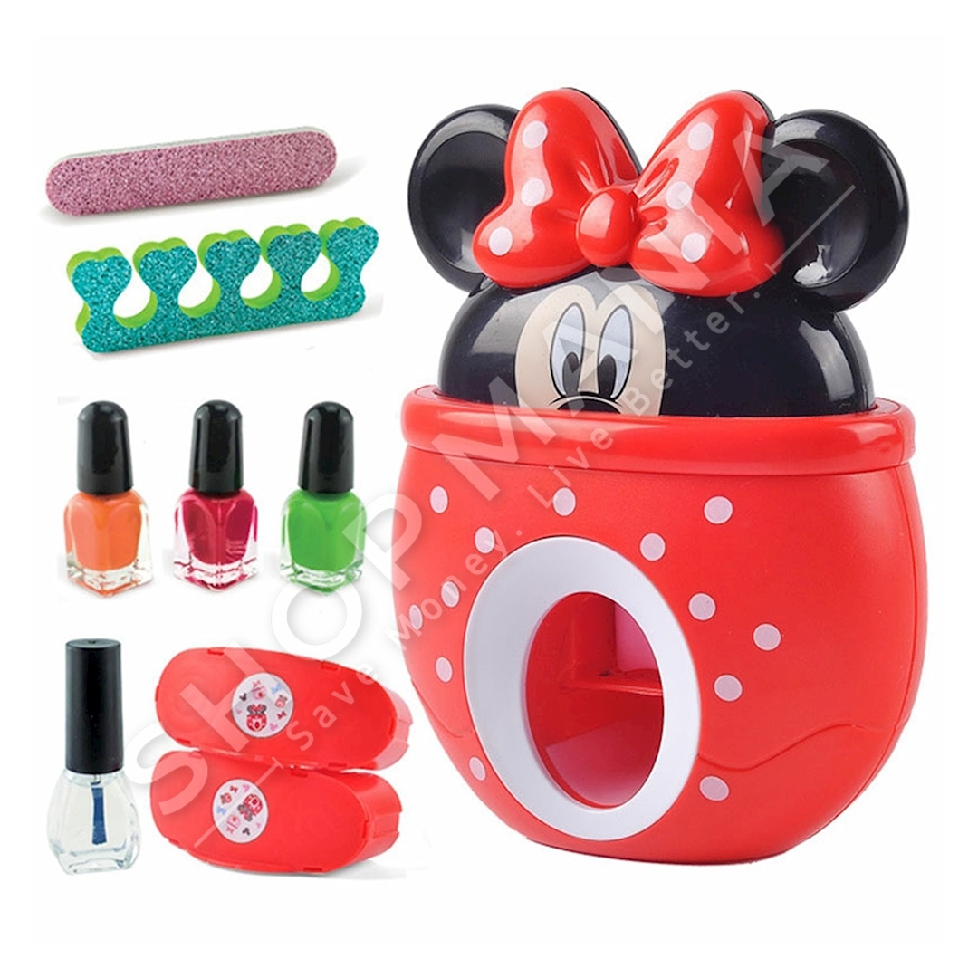 Ne set perfshihen: nje pajisje per stampimin e thonjve me dizajn Minnie Mouse, 4 manikyra, furca makeup-i, ndarese per thonjte, forma te ndryshme per stampim, buzekuq, blusher dhe nje zbutes per thonjte.
