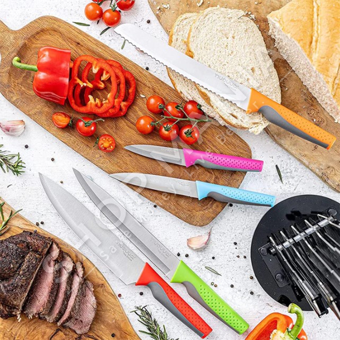 Seti permban 6 cope:- 5 thika te madhesive te ndryshme- Mbajtese thikash prej celik inoksiNgjyra: E zeze, e kuqe, portokalli, blu, mente, lejlaTe sigurta per larje ne lavastovilje