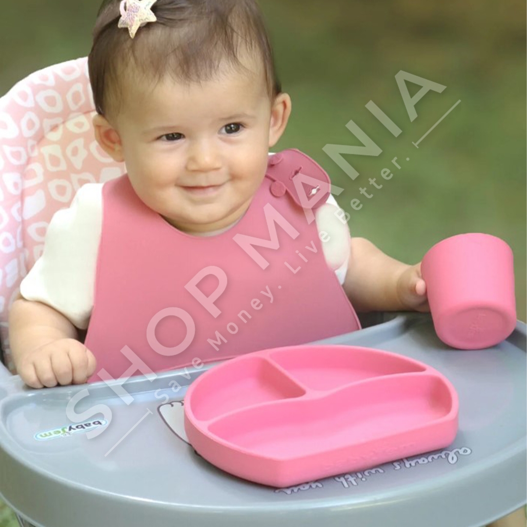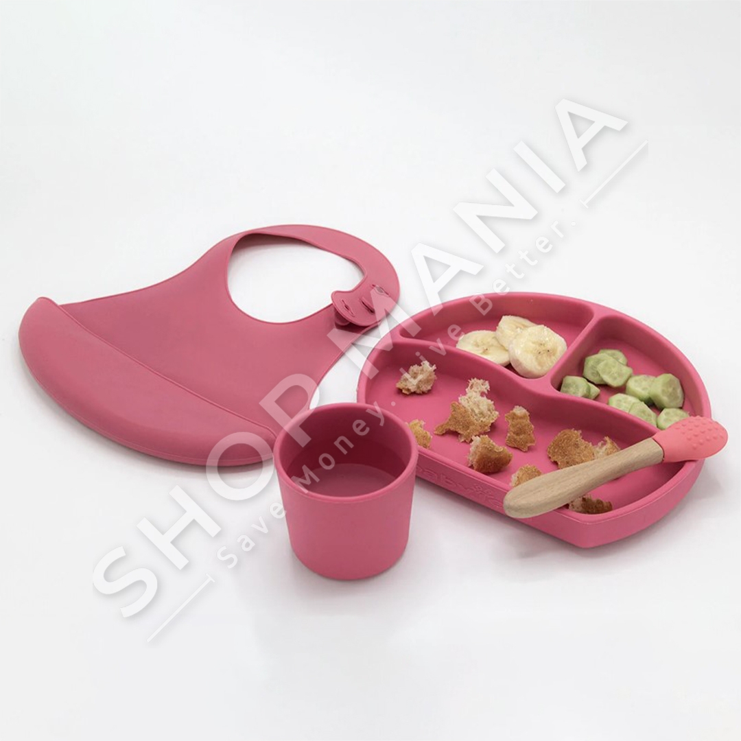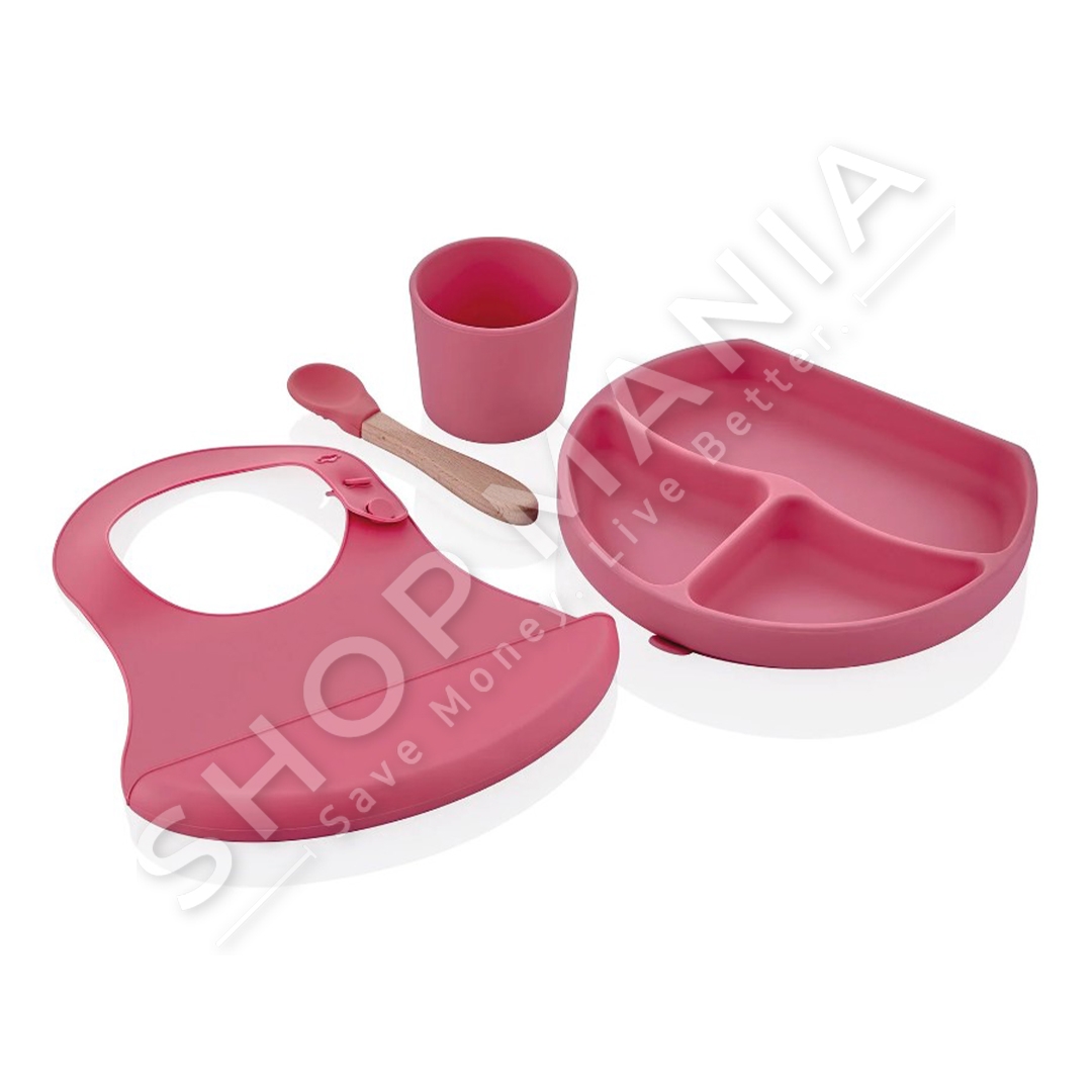 Përshkrimi: Set unik per ushqyerje te femijes tuaj. Seti permban: 1 pjate me 2 ndarje, 1 tas, 1 gote dhe 1 luge me maje silikoni.