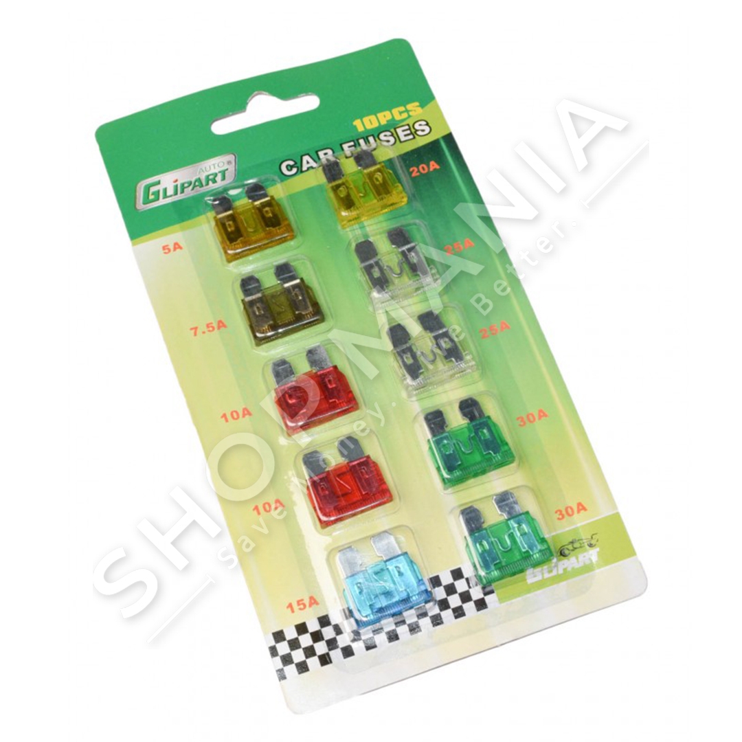 Ne paketim perfshihen 10 siguresa me amperazhe si me poshte: 5A, 7.5A, 10A, 10A, 15A, 20A, 25A, 25A, 30A, 30A
