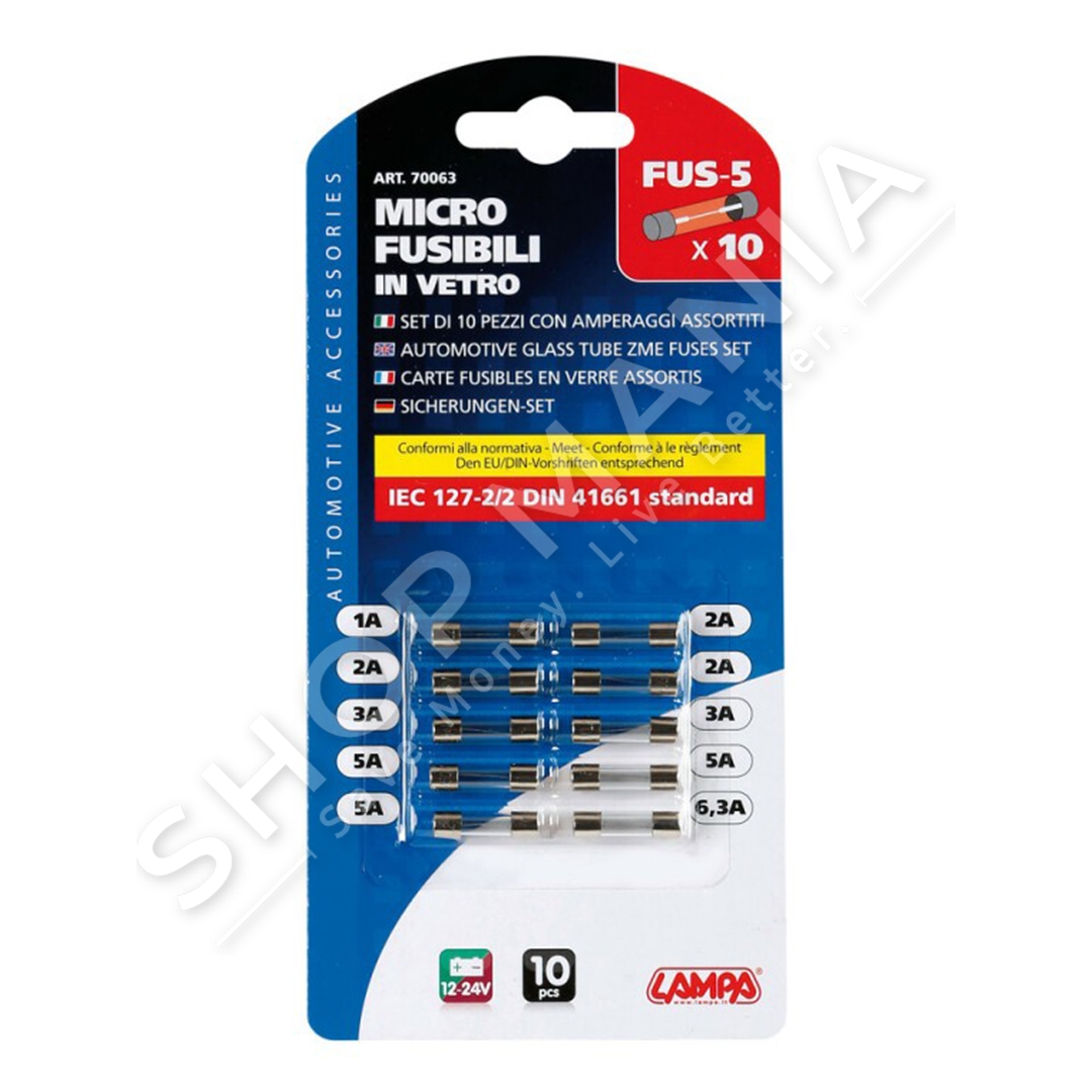 Ne paketim perfshihen 10 siguresa me amperazhe si me poshte: 1A, 2A, 2A, 2A, 3A, 3A, 5A, 5A, 5A, 6.3A.