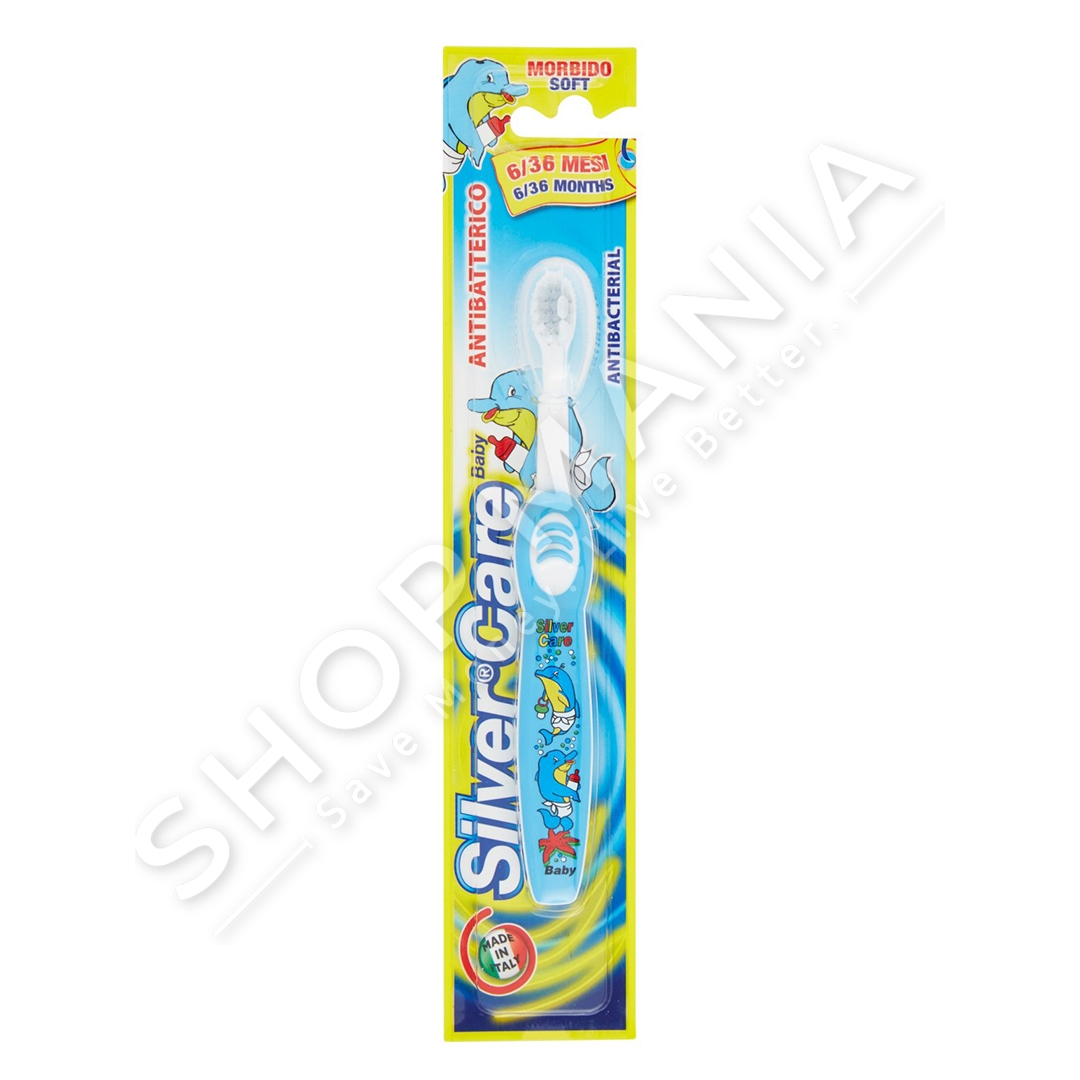 Furce dhembesh per femije nga 6-24 muaj nga Silver Care. Me doreze ideale per t'u perdorur nga prinderit te cilet duhet te lajne butesisht dhembet e pare te foshnjes. Furce me koke antibakteriale jo te levizshme e cila lejon higjenen e duhur orale te dhembeve te foshnjes. Koka e rrumbullakosur dhe qimet e buta masazhuese me majat e rrumbullakta jane te pershtatshme per mishrat delikate.