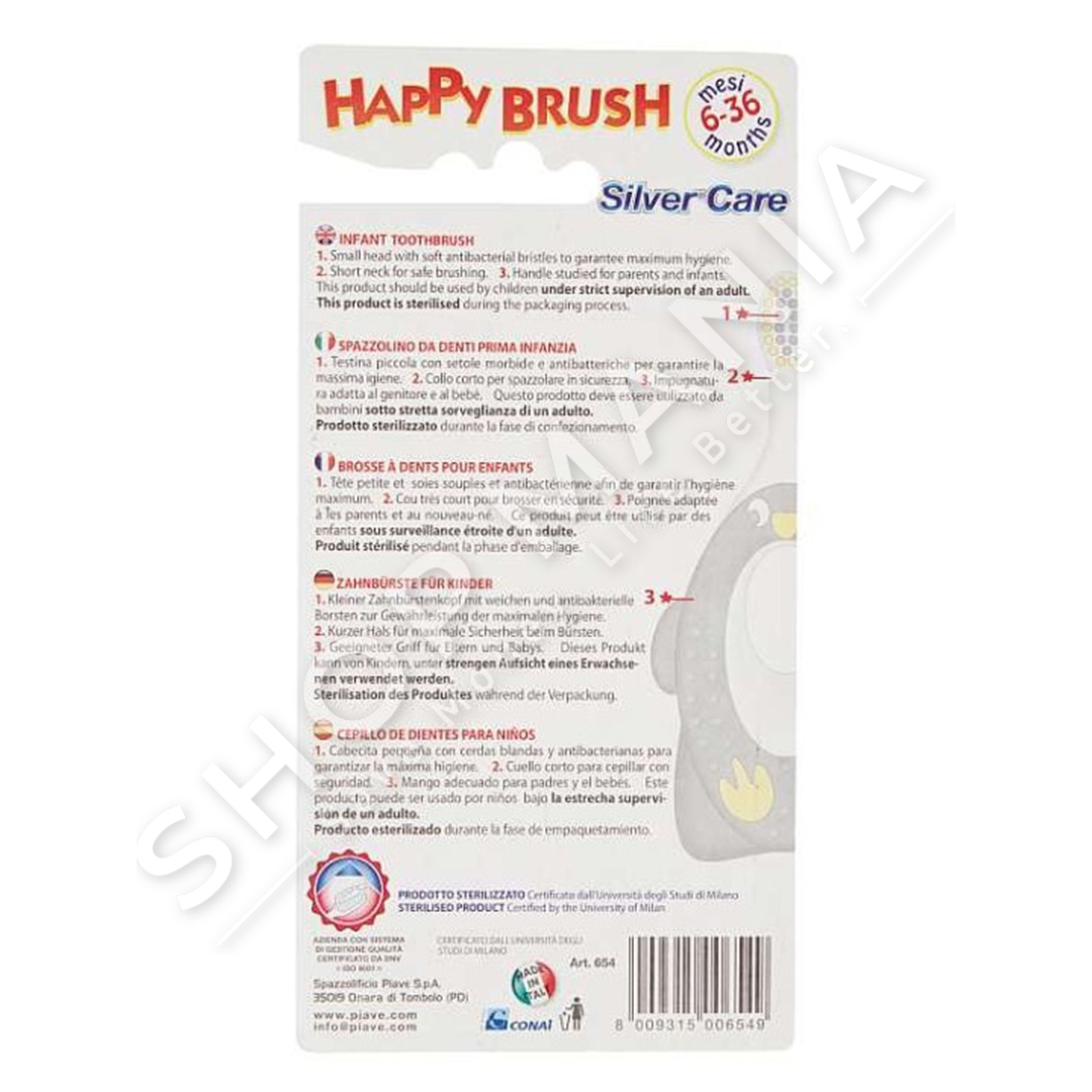 Furce dhembesh per femije 6-36 muajsh Happy Brush Soft nga Silver Care. Me nje shtrese antibakteriale per pastrimin e dhembeve te pare te femijes dhe ne forme lodre pinguini. Qimet e furces jane bere nga fibra hipoalergjike dhe te veshura me argjend. Kur furca e dhembeve bie ne kontakt me ujin, jonet e argjendit aktiv shkaterrojne bakteret dhe zvogelojne numrin e tyre ne 6 ore me 3-4 here. Doreza e furces eshte ne formen e nje pinguini, i cili siguron masazh shtese te mishrave te dhembeve, duke zvogeluar ndjesite e dhimbshme gjate shperthimit te dhembeve te pare.