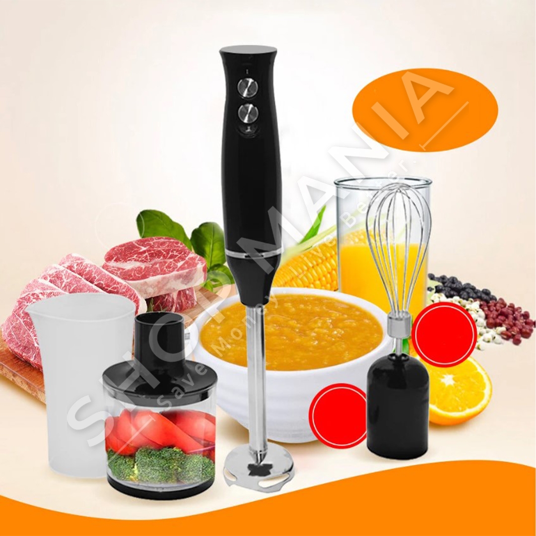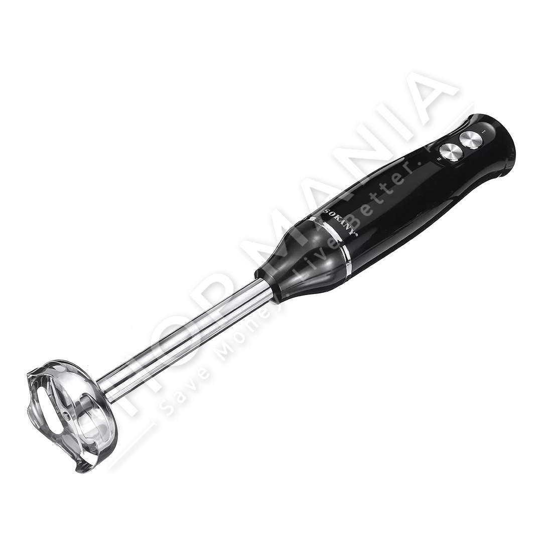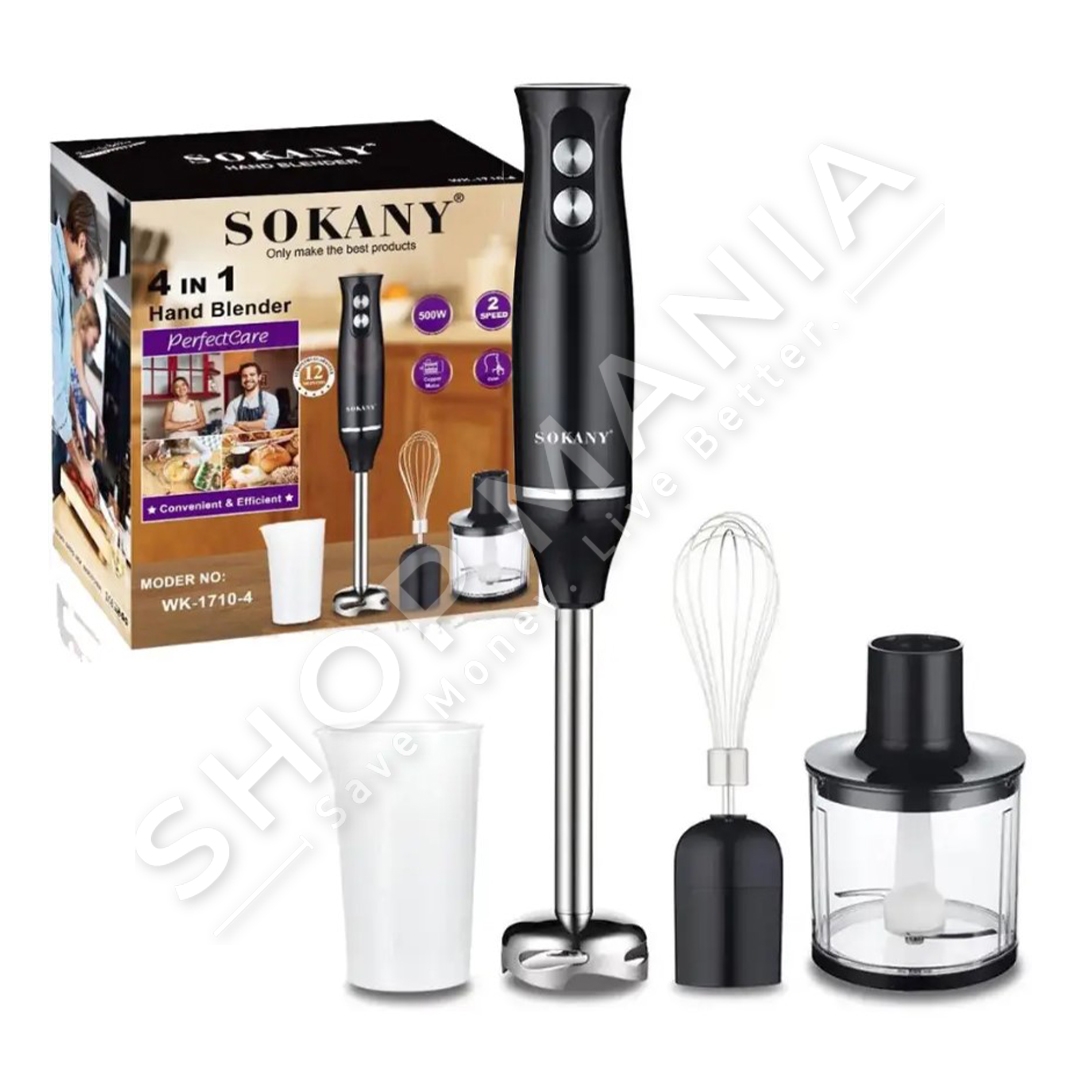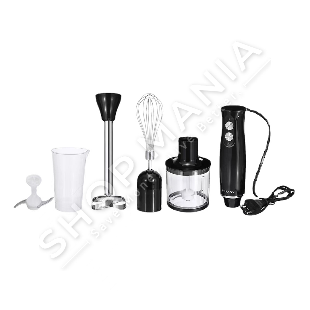 Blender dore shumefunksional "Sokany WK-1710-4 4 in 1 Hand Blender" me aksesore per te kryer funksione te rendesishme ne kuzhine: perzierje, rrahje, pure patatesh, grirje, prerje dhe copetim.