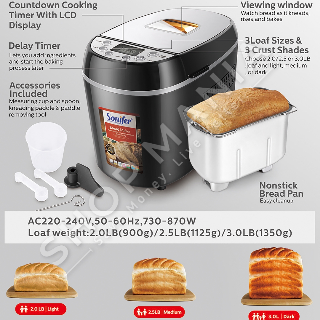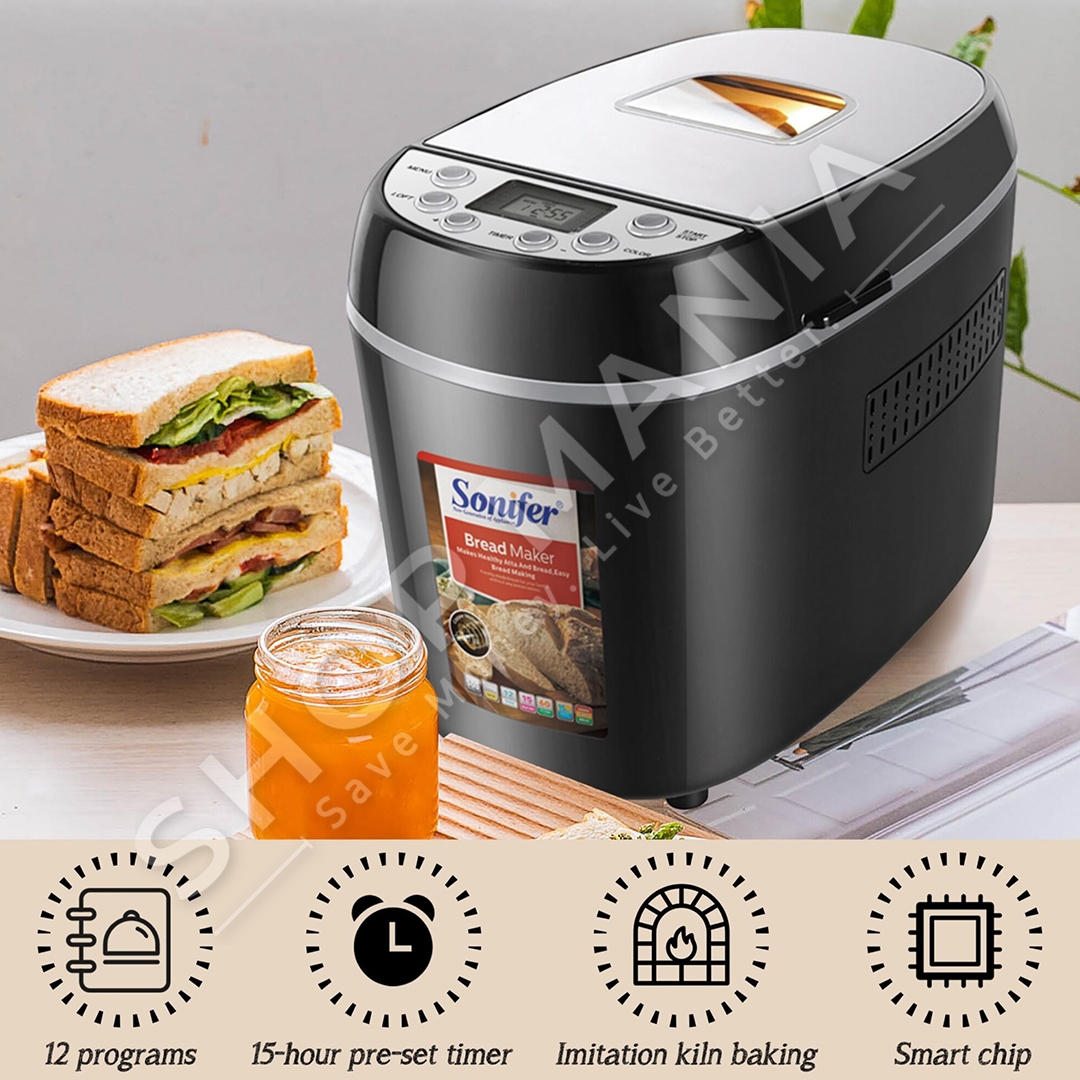 Berese buke Sonifer SF-4005 ideale per pergatitjen e bukes ne shtepi. Materiali i enes eshte me veshje qe nuk ngjit, lehtesisht e pastrueshme. Me 12 programe duke perfshire funksionin ultra te shpejte. Me program qe mban buken te ngrohte deri ne 60 minuta. E pajisur me dritare qe lejon te shikoni here pas here gjendjen e bukes. E pajisur me aksesoret shtese: 1 kupe, 1 luge matese dhe perzierese brumi.