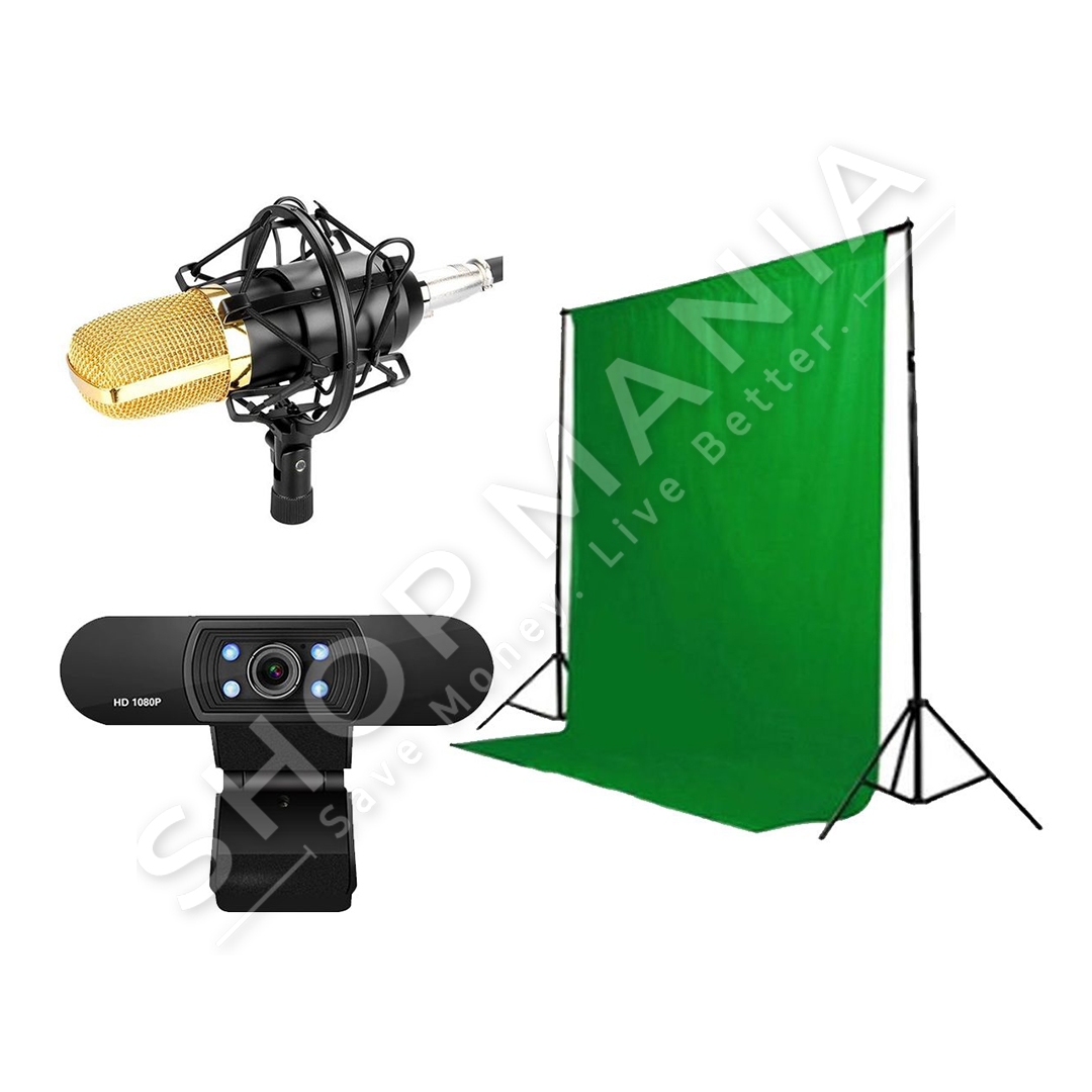 Paketa perfshin web-kameren, mikrofon, tripodin dhe ekranin jeshil.