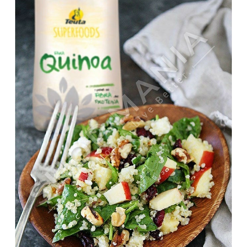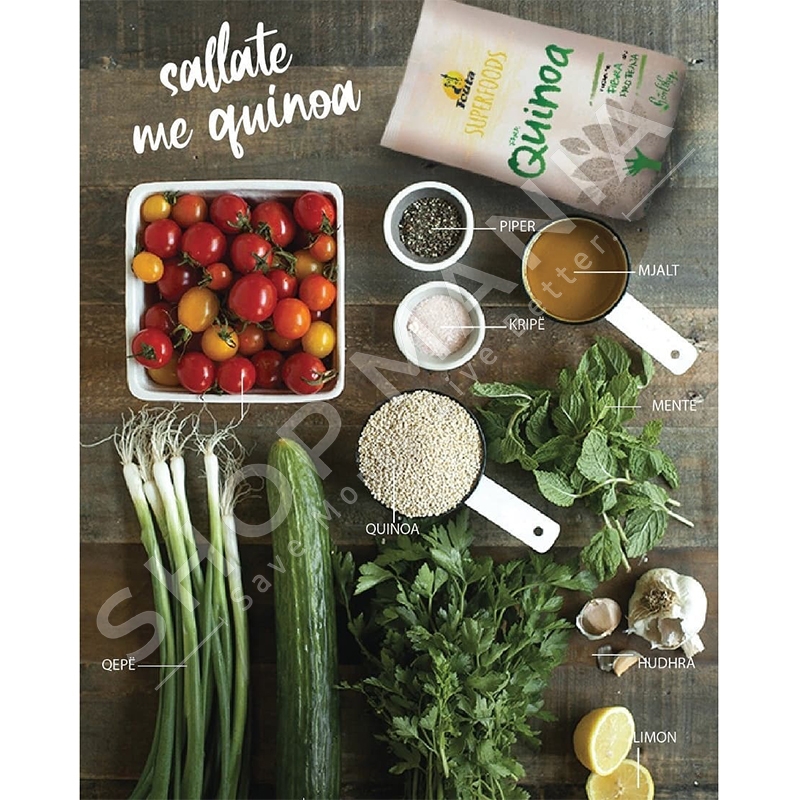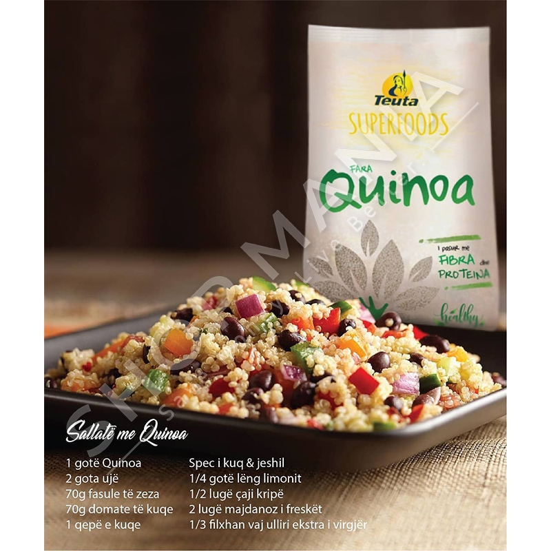 Quinoa permban 14 deri ne 18gr proteina dhe vlera shume te larta te vitaminesB-kompleks, vitamines A dhe antioksidanteve qe sherbejne per te luftuarradikalet e lira ne trup.