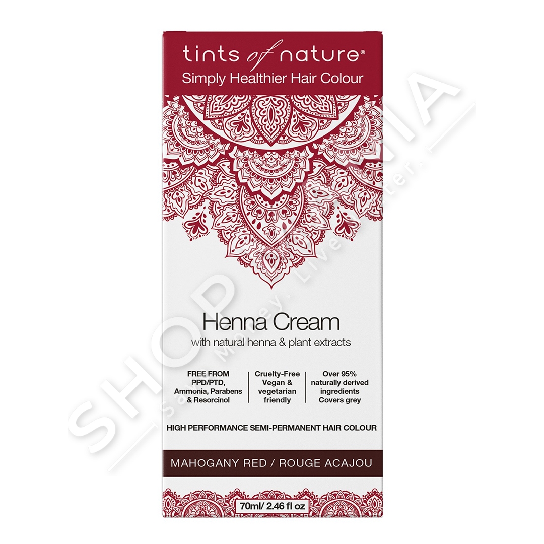 Krem kena "Tints of Nature Henna Cream Mahogany Red" per floke te kuq, te shendetshem dhe plot shkelqim.