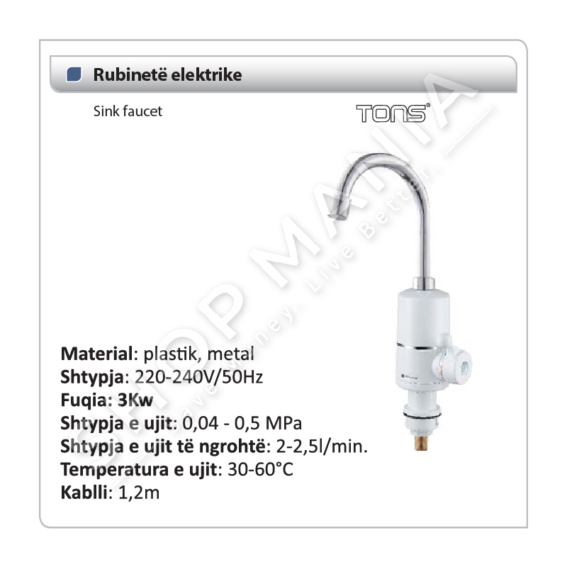 Rubineti elektrik TONS per ngrohjen e ujit siguron ngohjen e ujit deri ne 60 ° ne menyre te menjehershme..